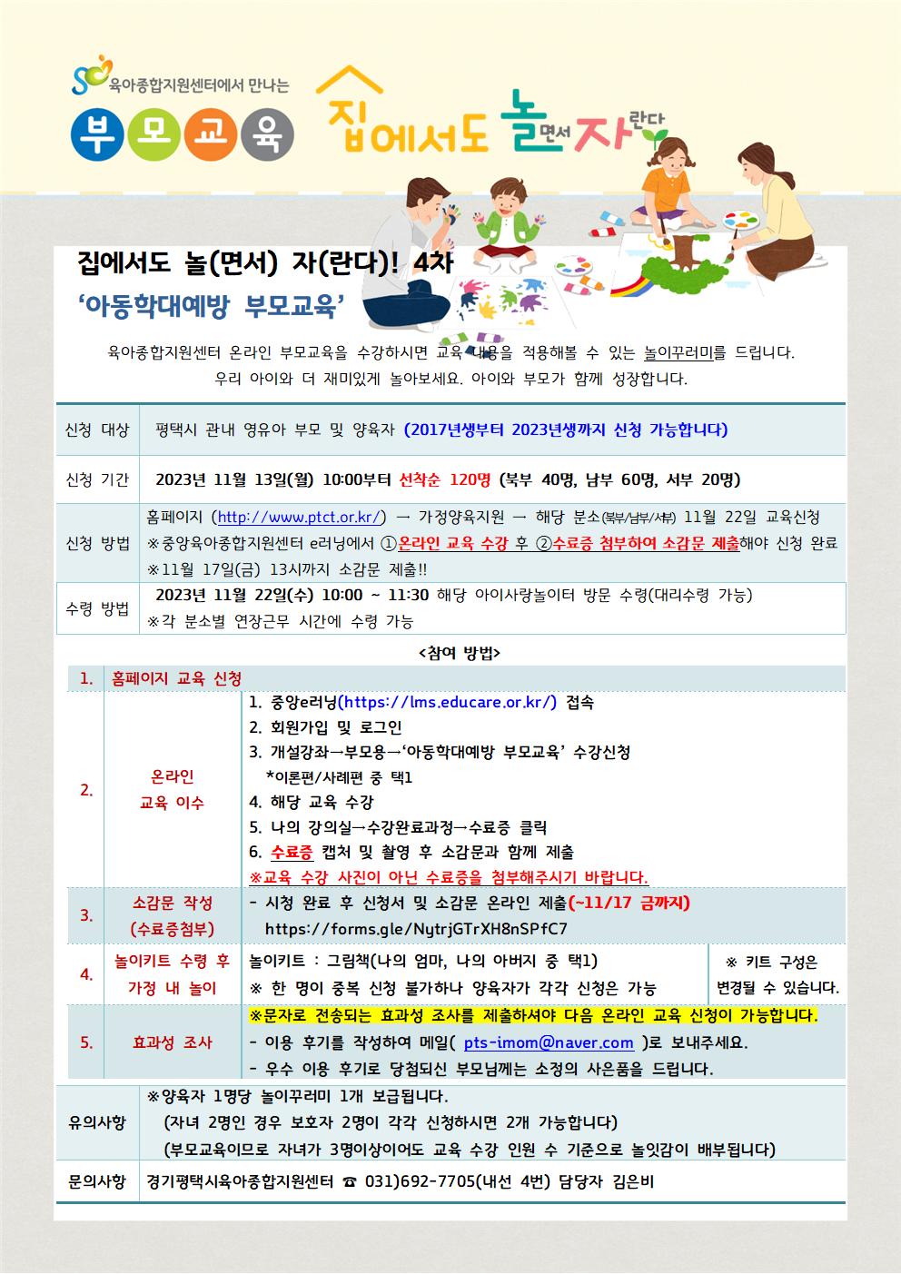 ***반드시 읽어주세요**** (2023년 변경사항) ① 센터 홈페이지 신청 ② 온라인 교육 이수 ****링크를 문자로 전송해드리지 않으니 꼭 확인해주시기 바랍니다. - 중앙 e러닝 홈페이지(https://lms.educare.or.kr/) 회원가입 및 로그인 - 개설강좌→부모용→'아동학대예방부모교육'(이론편/사례편 택1) 수강신청 - 해당 교육 수강 - 나의 강의실→수강완료과정→수료증 클릭 - 수료증 스캔 및 촬영 후 소감문과 함께 제출 **꼭!! 수료증 이미지파일을 첨부해주세요. (교육 수강 사진 X) ③소감문 작성 * 소감문 바로가기 (https://forms.gle/NytrjGTrXH8nSPfC7) (클릭) * 필수 작성 항목을 정확하게 기입해주시기 바랍니다. * 놀이꾸러미 선택(그림책 : 나의 아버지 또는 나의 엄마) 후 수정 불가!!!