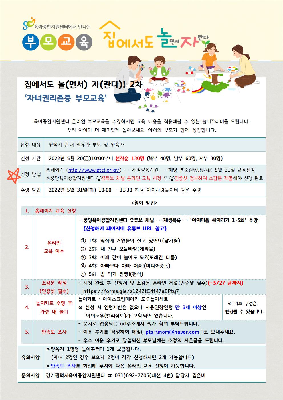 | 집에서도 놀(면서) 자(란다)! *온라인 부모교육을 수강하시고, 자녀와 놀이꾸러미로 더 재미있게 놀아보세요! - 신청대상 : 평택시 관내 영유아 자녀를 둔 부모 및 양육자 - 신청일 : 5월 20일(금) ~ 5월 27일(금) 선착순 60명 - 배부일 : 5월 31일(화) 10:00 ~ 11:30 - 배부장소 : 서부아이사랑놀이터 소감문은 5월 27일(금) 오후 1:00까지 작성해주세요. 접수되지 않을 경우 대기자에게 순서가 돌아갑니다. ※ 놀이키트 구성품 중 아이도우(컬러점토)는 만 3세 이상 권장하고 있습니다. 영아는 가정에서 천사점토 등을 준비하여 놀이해주시기 바랍니다. [접수방법] ① 센터 홈페이지 신청 ②온라인 교육 이수(인증샷 필수) <온라인 교육 링크주소> '[공통부모교육] 자녀권리존중 부모교육 범주① 아이마음헤아리기 1~5화' (아래 제목 클릭) '아이마음헤아리기' 1화 옆집에 거인들이 살고 있어요(낯가림) - YouTube '아이마음헤아리기' 2화 내 친구 보들빠방(애착물) - YouTube '아이마음헤아리기' 3화 이제 같이 놀아도 돼?(또래간 다툼) - YouTube '아이마음헤아리기' 4화 아빠보다 아빠 어플!(미디어중독) - YouTube '아이마음헤아리기' 5화 밥 먹기 전쟁!(편식) - YouTube