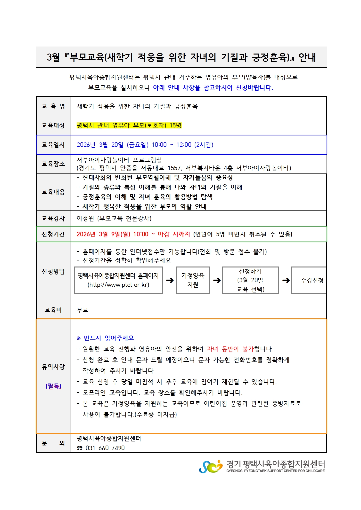 | 교육명 | 자체부모교육 - 새학기 적응을 위한 자녀의 기질과 긍정훈육 | 교육형태 | 오프라인 소규모 |