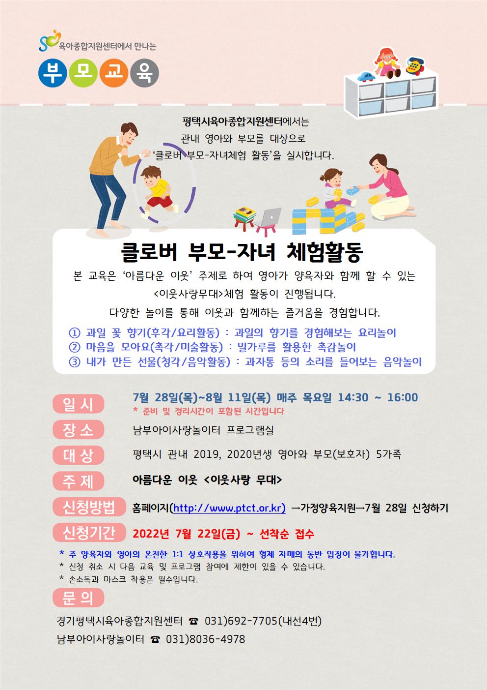 ☎문의: 평택시육아종합지원센터 부모교육 담당자(031-692-7705 내선4번) ![]() |