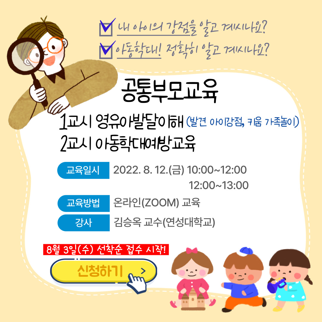 ※ 1교시 영유아발달이해 부모교육, 2교시 아동학대예방 부모교육이 진행됩니다. 가능한 1교시와 2교시 함께 참여해주시기 바랍니다(부분 참여 가능). 모두 참석을 원하시는 분은 1교시, 2교시 각각 신청해주시기 바랍니다.