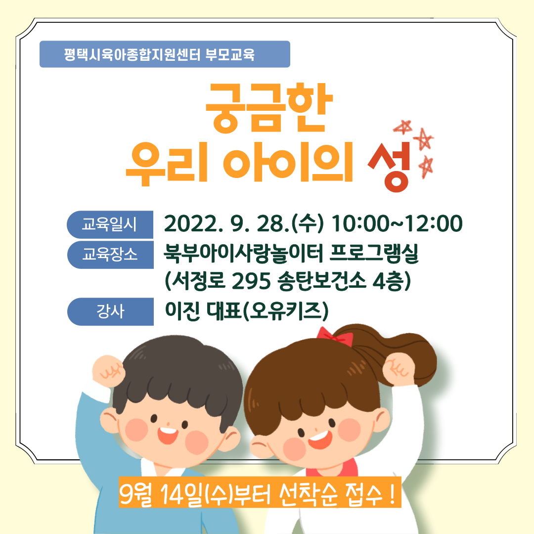 ▶ 신청 대상 : 평택시 관내 유아(16년생~18년생) 자녀를 둔 부모 20명 ▶ 교육 장소 : 북부아이사랑놀이터 프로그램실(평택시 서정로 295 송탄보건소 4층) ▶ 교육 일시 : 9월 28일(수) 10시 00분 ~ 12시 00분 ▶ 신청 일시 : 9월 14일 (수) 오전 10시 ~ 선착순 마감