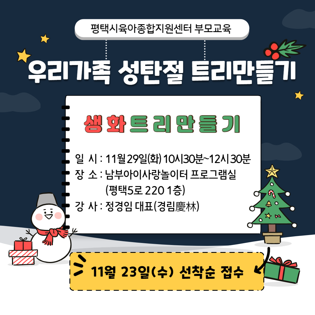 | 교육명 | 우리 가족 성탄절 트리 만들기 | 교육형태 | 오프라인 소규모 |