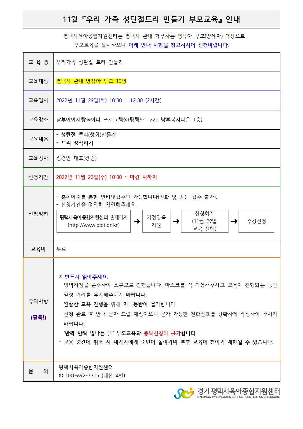 ▶ 신청 대상 : 평택시 관내 영유아 자녀를 둔 부모 10명 ('반짝반짝 빛나는 날' 부모교육과 중복 신청 불가) ▶ 교육 장소 : 남부아이사랑놀이터 프로그램실(평택5로 220 1층) ▶ 교육 일시 : 11월 29일(화) 10시 30분 ~ 12시 30분 ▶ 신청 일시 : 11월 23일(수) 오전 10시 ~ 선착순 마감