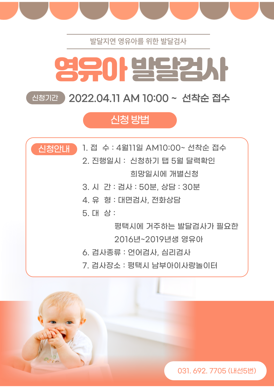 검사일시 - 5월13일 15:00~15:50 (영유아 동반 대면검사) 상담일시 - 5월 27일 13:00~13:30 (비대면 전화상담) |