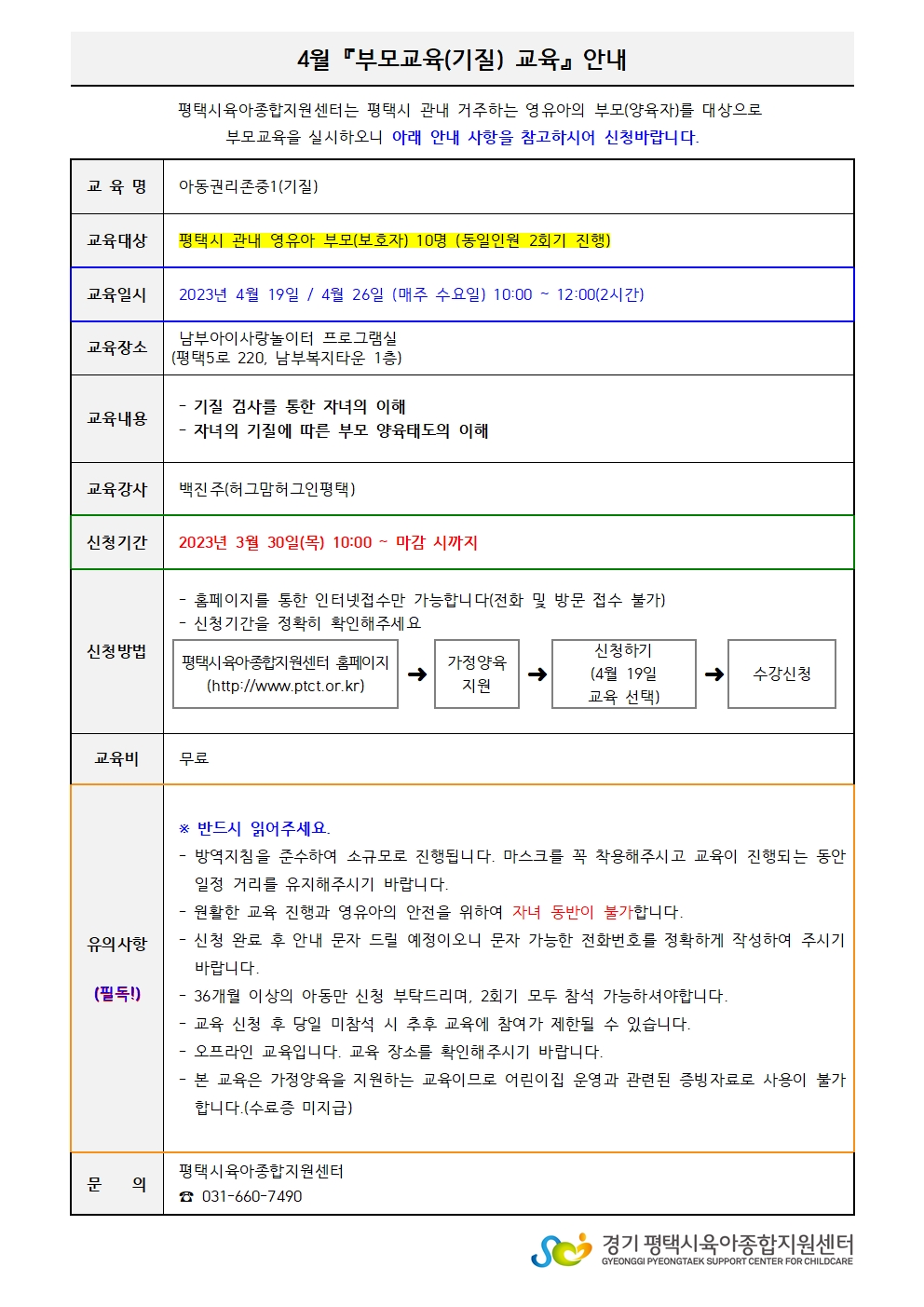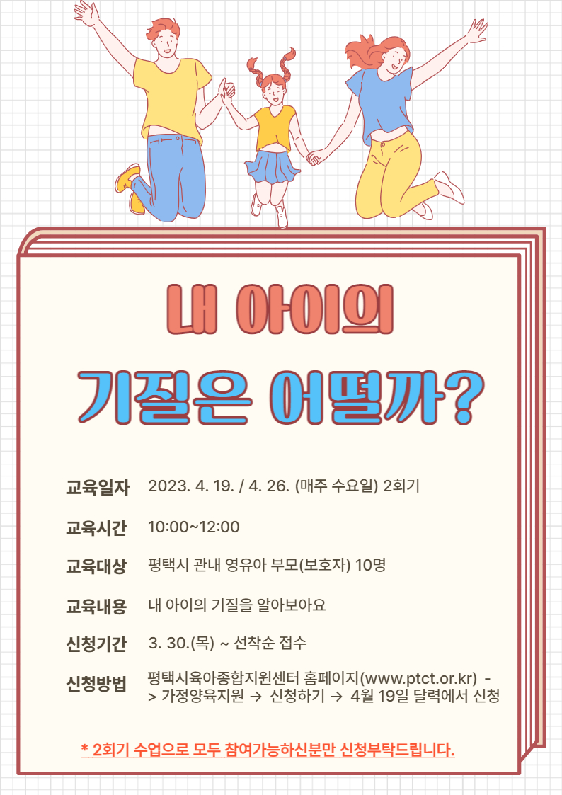 * * 반드시 읽어주세요 * * ※ 평택시 관내 영유아 가정양육을 지원하는 교육으로, 수료증 발급은 되지 않습니다. ※ 신청 취소 시 다음 교육 및 프로그램 참여에 제한이 있을 수 있습니다. ※ 2회기로 진행되는 교육입니다. 모두 참석 가능하신분만 신청부탁드립니다. ※ 36개월 이상의 아이만 신청부탁드립니다. 36개월 이하는 다른 검사이기 때문에 맞지않음. ※ 원활한 교육진행과 영유아의 안전을 위하여 자녀 동반이 불가합니다. ☎문의: 서부아이사랑놀이터 부모교육 담당자(031-660-7490) ![]() ![]() |