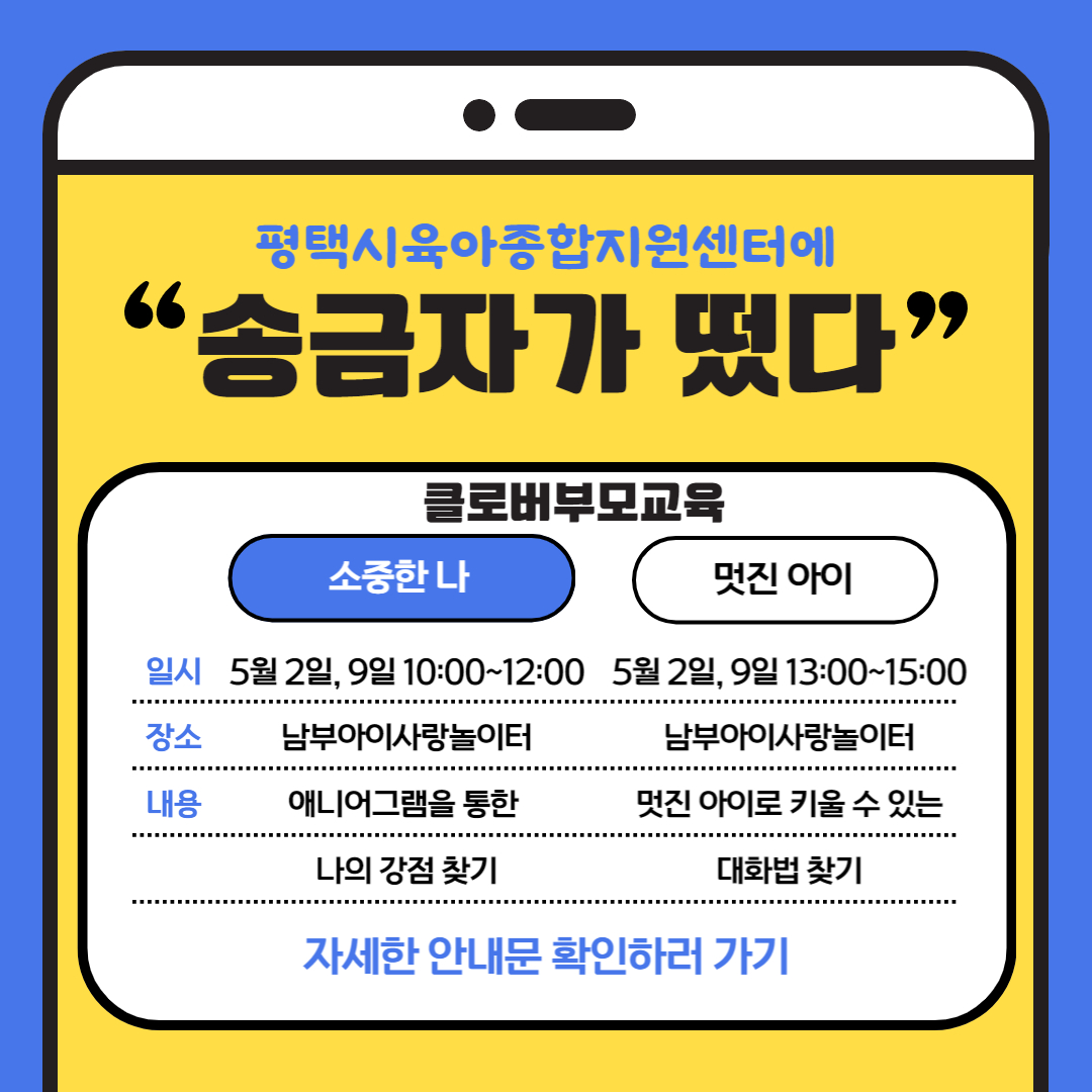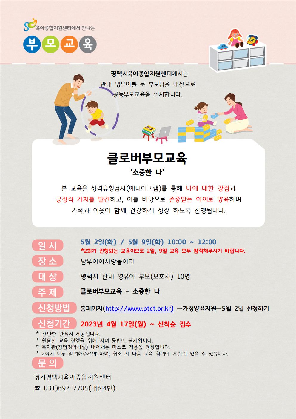 ☎문의: 평택시육아종합지원센터 공통부모교육 담당자(031-692-7705 내선4번) |