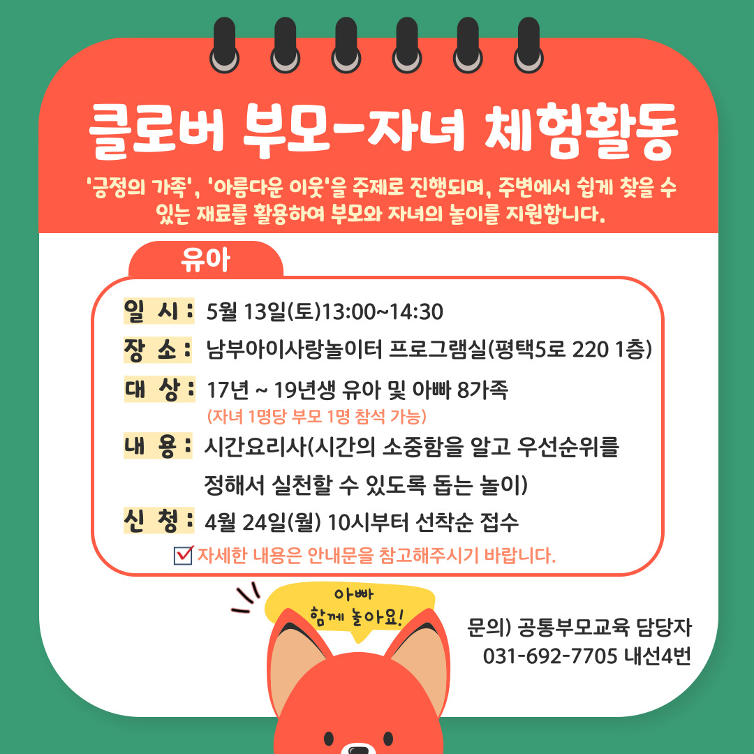 | 교육명 | 클로버 부모-자녀 체험활동 (유아/주말/아빠대상) | 교육형태 | 오프라인 소규모 |