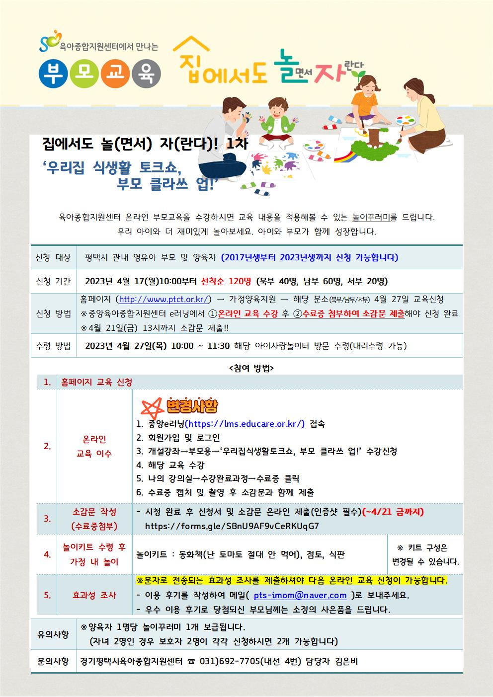 ***반드시 읽어주세요**** (2023년 변경사항) ① 센터 홈페이지 신청 ② 온라인 교육 이수 ****링크를 문자로 전송해드리지 않으니 꼭 확인해주시기 바랍니다. - 중앙 e러닝 홈페이지(https://lms.educare.or.kr/) 회원가입 및 로그인 - 개설강좌→부모용→'우리집 식생활 토크 쇼, 부모 클라쓰 업!' 수강신청 - 해당 교육 수강 - 나의 강의실→수강완료과정→수료증 클릭 - 수료증 캡처 및 촬영 후 소감문과 함께 제출