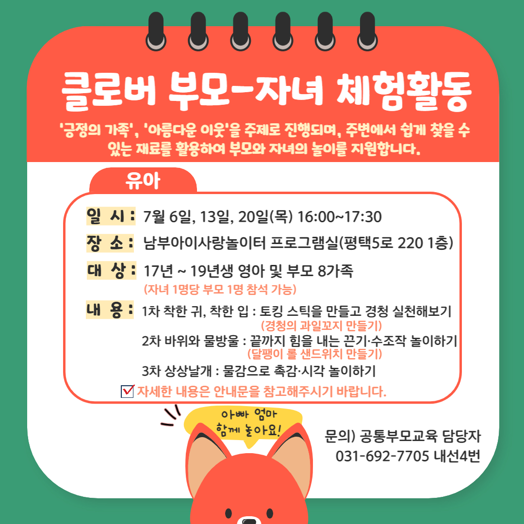 | 교육명 | 클로버 부모-자녀체험활동(유아) | 교육형태 | 오프라인 소규모 |