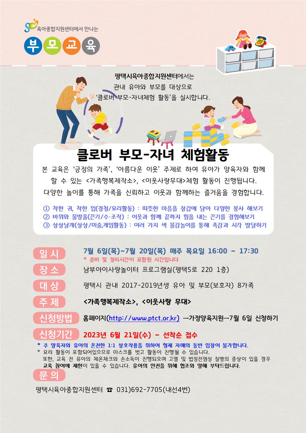☎문의: 평택시육아종합지원센터 부모교육 담당자(031-692-7705 내선4번) ![]() ![]() |