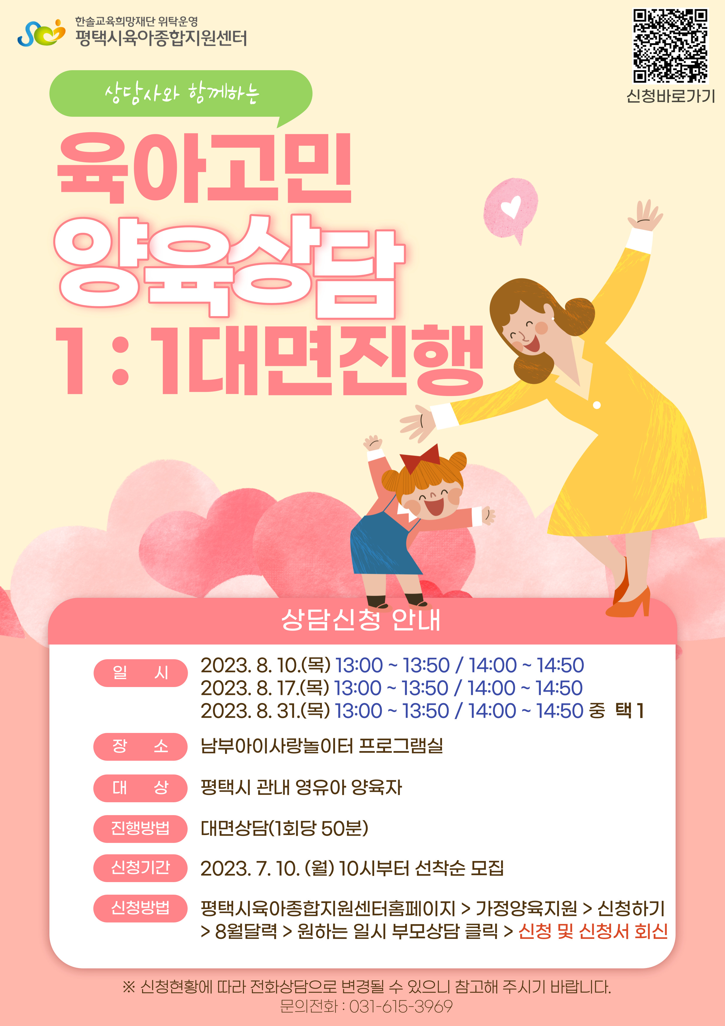 ▶ 상담진행일시 : 2023. 8. 31.(목) 14:00~14:50 / ※ 대면상담 중복신청은 불가합니다. ▶ 상담진행장소 : 남부아이사랑놀이터 프로그램실 ▶ 신청 대상 : 평택시 관내 미취학 영유아 양육자 ▶ 진행 방법 : 대면상담(50분) ▶ 진행 절차 : 홈페이지를 통해 신청접수 → 상담전까지 첨부파일 [부모상담신청서 및 동의서] 메일로 회신 → 대면상담 진행