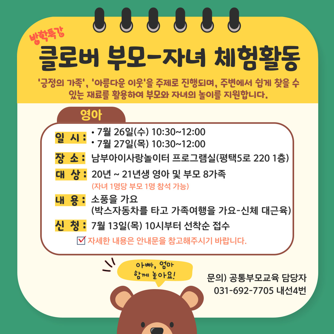 ** 반드시 읽어주세요 ** - 일시 : 7월 26일 10시 30분~12시 - 강사 : 윤현경 강사(공통부모교육 강사진) - 장소 : 남부아이사랑놀이터 프로그램실 ※ 신청기간 : 7월 13일(목) 10시부터 선착순 접수 ※ 취소 시 대기자 접수를 위하여 최소 전 날 까지는 꼭 전화주시기 바랍니다. ※ 26일과 동일한 교육이므로 중복 신청이 불가합니다. ※ 복지관 내 이동시에는 마스크 착용을 권장하고 있습니다. 또한, 교육장소에서는 마스크는 자율적 선택으로 진행되기 때문에 교육 전 영아의 체온체크가 진행되오며 고열 및 법정전염성의 증상이 있을 경우 교육 참여에 제한이 있을 수 있습니다. 영아의 안전을 위해 협조와 양해 부탁드립니다. ※ 준비 및 정리 시간이 포함된 시간입니다. 예정 시간보다 더 일찍 끝날 수 있습니다.