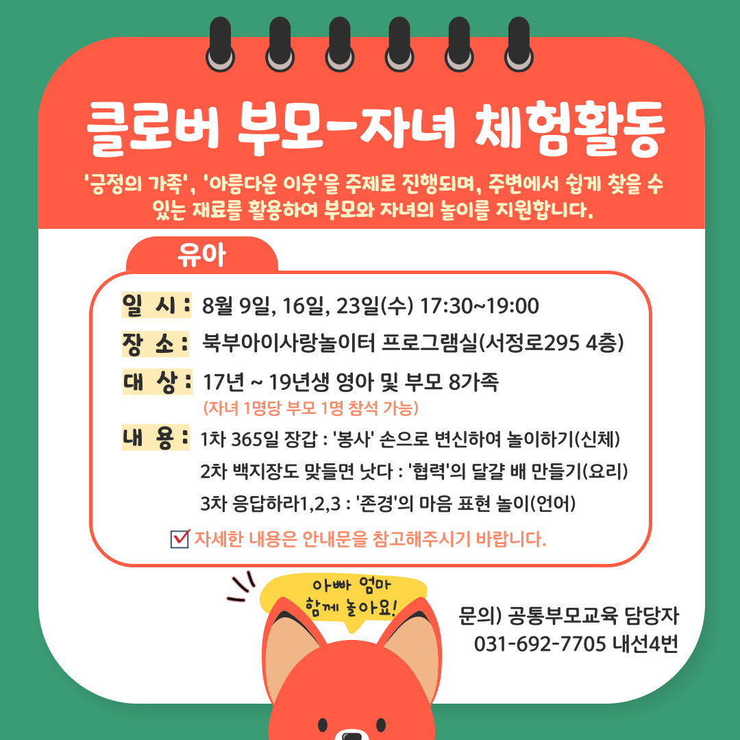 ** 반드시 읽어주세요 ** - 일시 : 8월 9일~8월 23일(수) 오후 5시 30분~7시 - 장소 : 북부아이사랑놀이터 프로그램실 ※ 꼭 3층 실외주차장에 주차해주시기 바랍니다(6시 이후 셔터 문 닫힘). ※ 취소 시 대기자 접수를 위하여 최소 전 날 까지는 꼭 전화주시기 바랍니다. ※ 3회기 모두 참석하셔야 합니다. 부분참석 불가하며 1회기 취소시 3회기 모두 취소됩니다. ※ 복지관 내 이동시에는 마스크 착용을 권장하고 있습니다. 또한, 교육장소에서는 마스크는 자율적 선택으로 진행되기 때문에 교육 전 영유아의 체온체크가 진행되오며 고열 및 법정전염성의 증상이 있을 경우 교육 참여에 제한이 있을 수 있습니다. 영유아의 안전을 위해 협조와 양해 부탁드립니다. ※ 준비 및 정리 시간이 포함된 시간입니다. 예정 시간보다 더 일찍 끝날 수 있습니다.