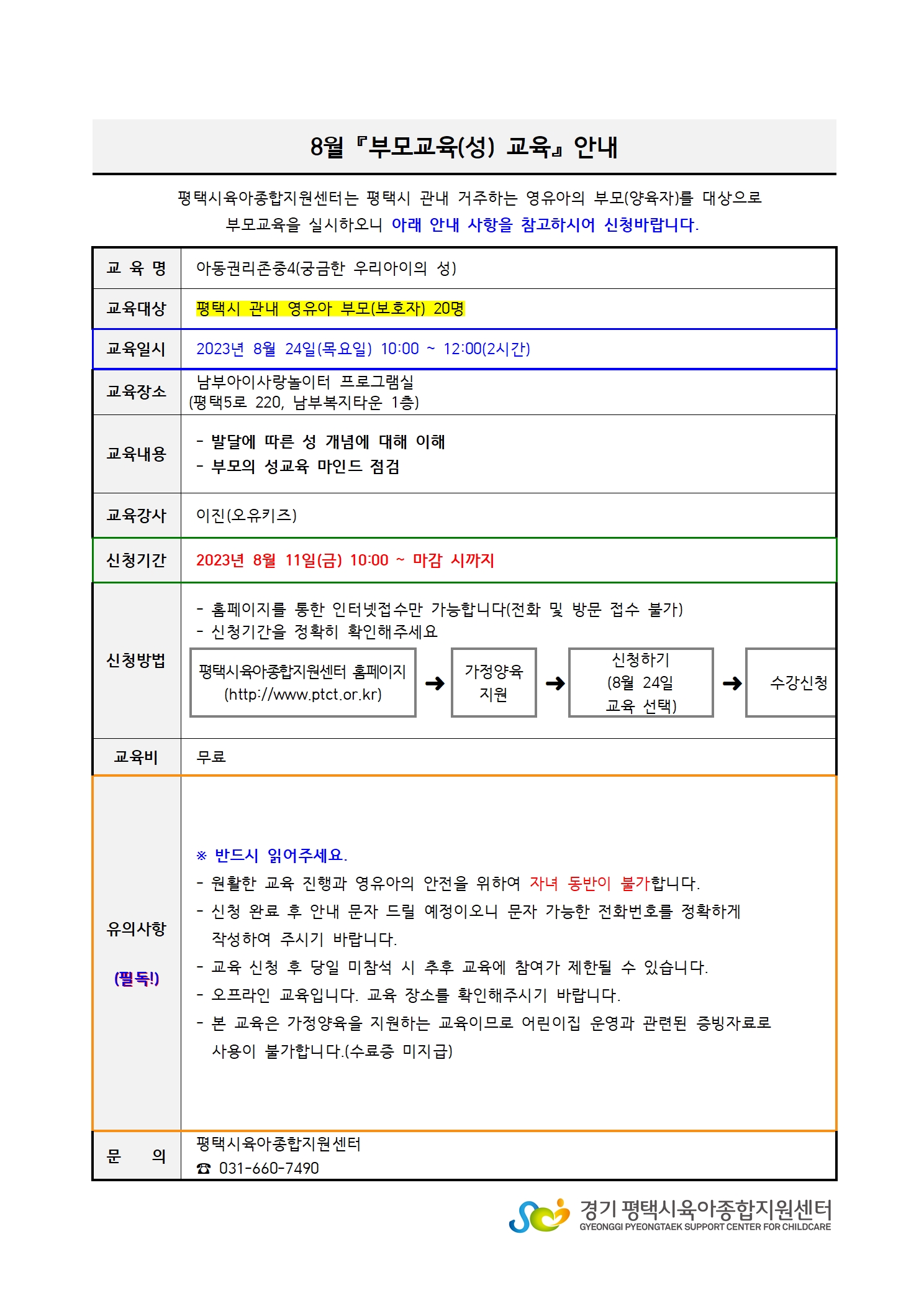 * * 반드시 읽어주세요 * * ※ 평택시 관내 영유아 가정양육을 지원하는 교육으로, 수료증 발급은 되지 않습니다. ※ 신청 취소 시 다음 교육 및 프로그램 참여에 제한이 있을 수 있습니다. ※ 참석 가능하신분만 신청부탁드립니다. ※ 원활한 교육진행과 영유아의 안전을 위하여 자녀 동반이 불가합니다. ☎문의: 자체부모교육 담당자(031-660-7490)