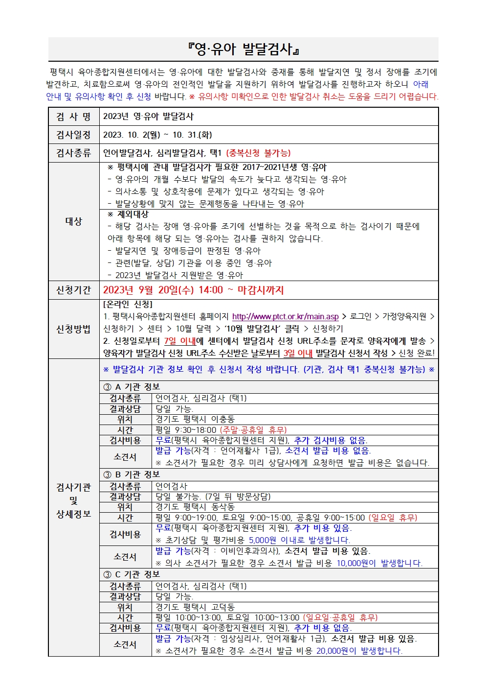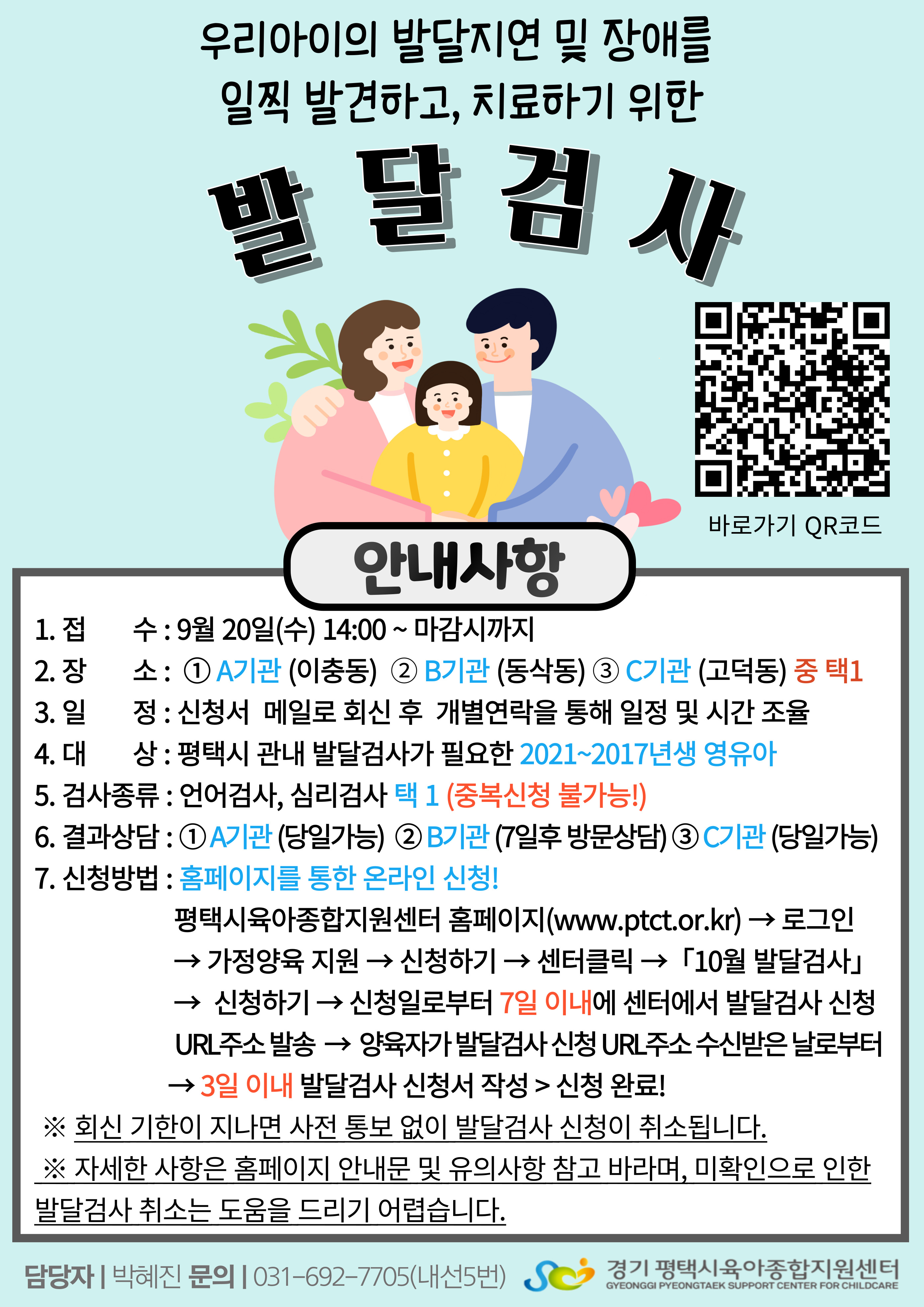 ※ 안내문 및 유의사항 미확인으로 인한 발달검사 취소는 도움을 드리기 어렵습니다. 아래 내용확인 후 발달검사 신청바랍니다. ![]() ![]() ![]() |