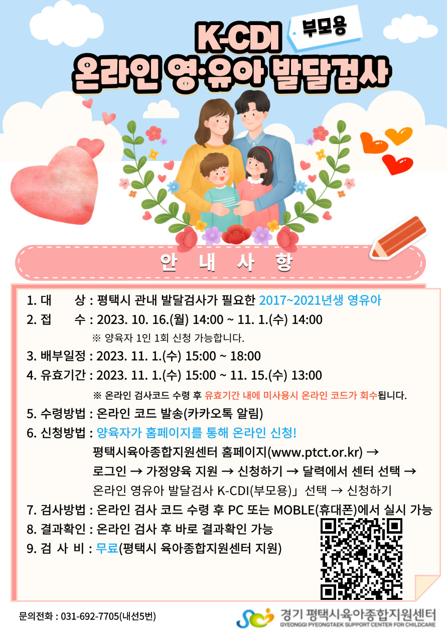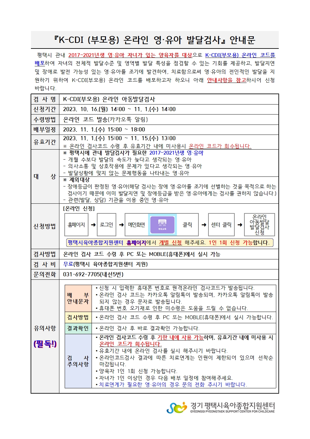 | 교육명 | [부모용]온라인 영유아 발달검사 K-CDI 검사 코드 발송(11.1.(수)15:00~18:00 순차적으로 배부) | 교육형태 | 온라인 검사 |