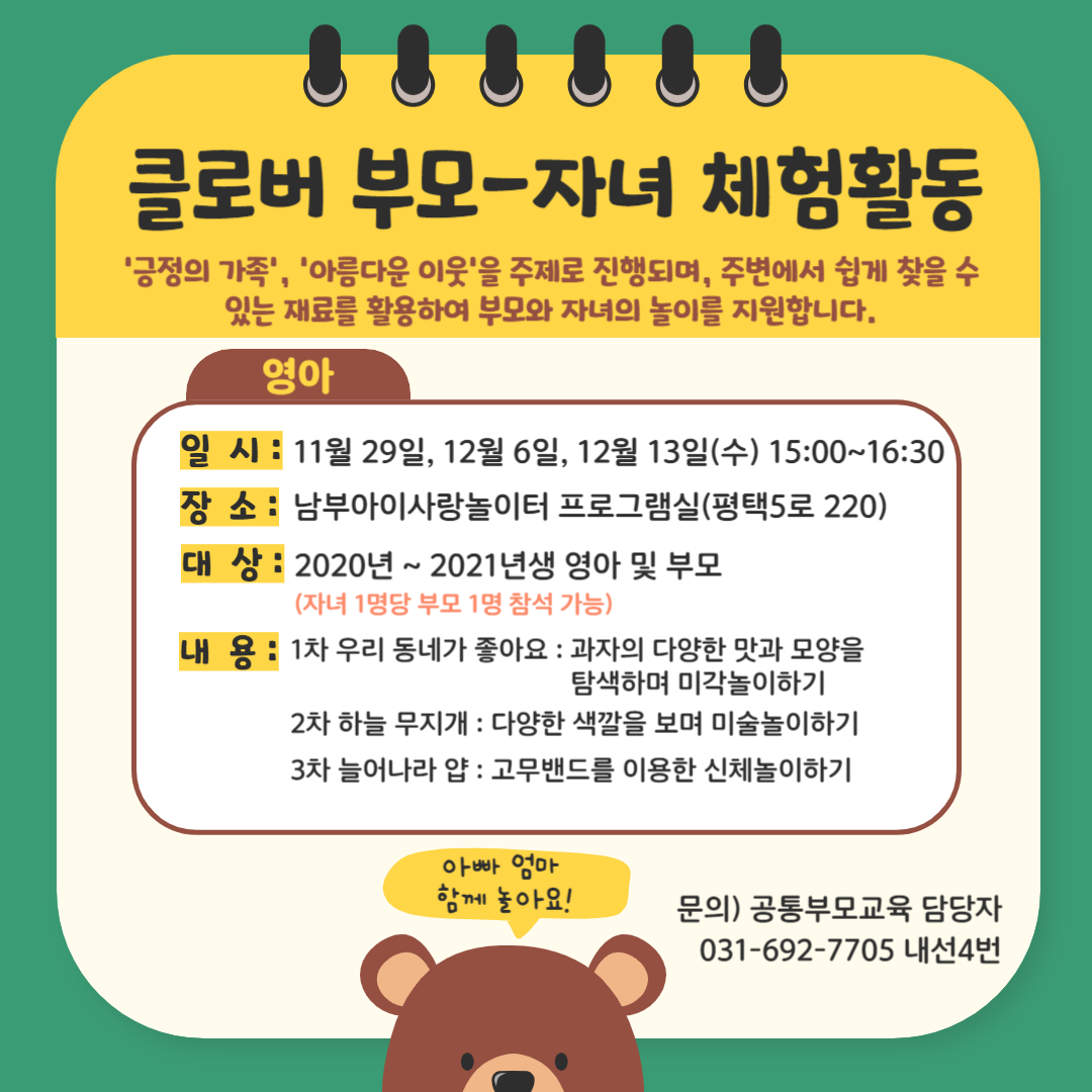 ** 반드시 읽어주세요 ** - 일시 : 11월 29일~12월 13일(수) 오후 3시 ~ 4시 30분 - 장소 : 남부아이사랑놀이터 프로그램실 ※ 주차가 혼잡할 수 있습니다. 만차 시 공영주차장을 이용해주시기 바랍니다(매봉산5길 35 / 주차요금발생) ※ 취소 시 대기자 접수를 위하여 최소 전 날 까지는 꼭 전화주시기 바랍니다. ※ 3회기 모두 참석하셔야 합니다. 부분참석 불가하며 1회기 취소시 3회기 모두 취소됩니다. ※ 교육장소에서는 마스크는 자율적 선택으로 진행되기 때문에 교육 전 영유아의 체온체크가 진행되오며 고열 및 법정전염성의 증상이 있을 경우 교육 참여에 제한이 있을 수 있습니다. 영유아의 안전을 위해 협조와 양해 부탁드립니다. ※ 준비 및 정리 시간이 포함된 시간입니다. 예정 시간보다 더 일찍 끝날 수 있습니다.