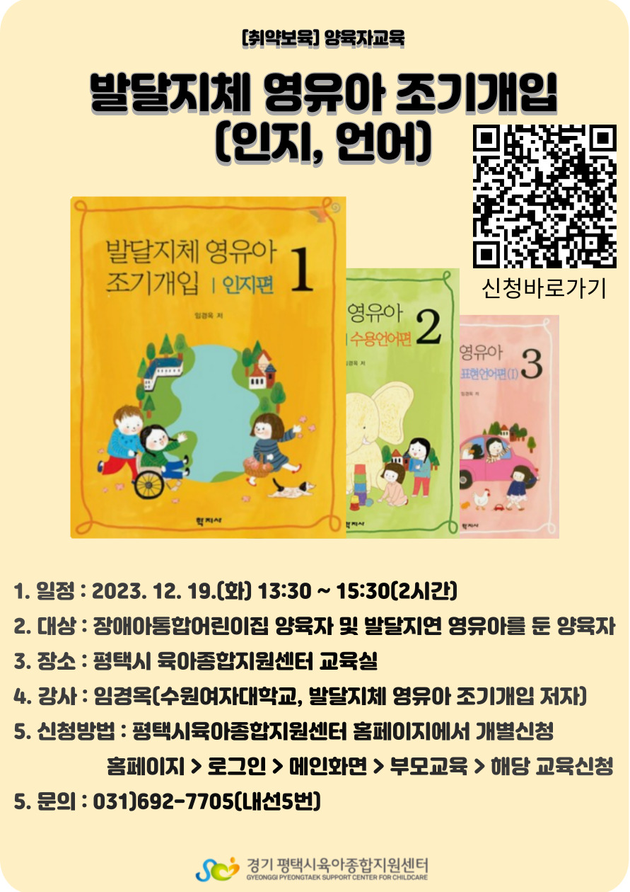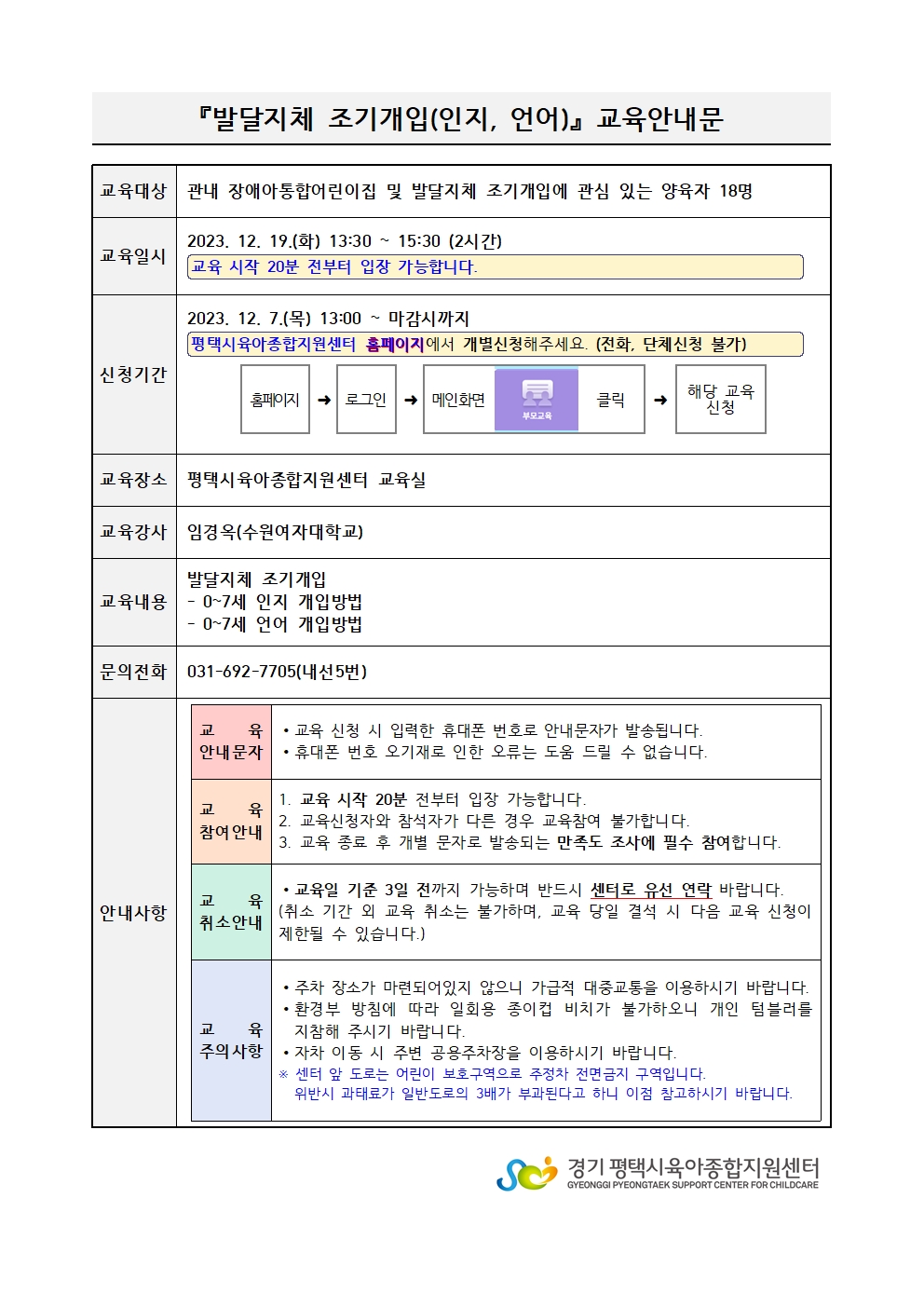 | 문의전화 | 031-692-7705(내선 5번) | 강 사 명 | 임경옥(수원여자대학교, 발달지체 조기개입 저자) |