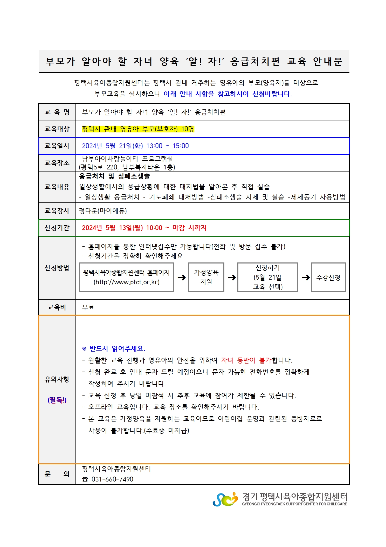 | 교육명 | 부모가 알아야 할 자녀 양육 '알! 자!' 응급처치편 | 교육형태 | 오프라인 소규모 |