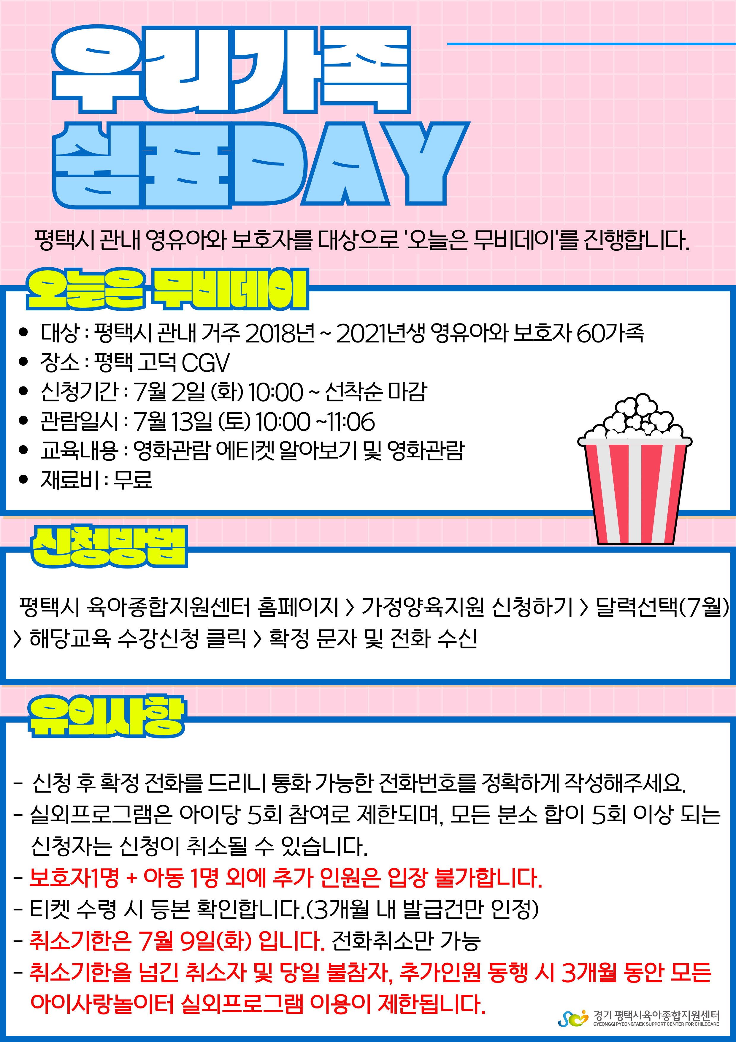| 교육명 | *7.2.(화) 신청* [부모-자녀] 우리가족 쉼표데이 '오늘은 무비데이' | 교육형태 | 오프라인 소규모 |