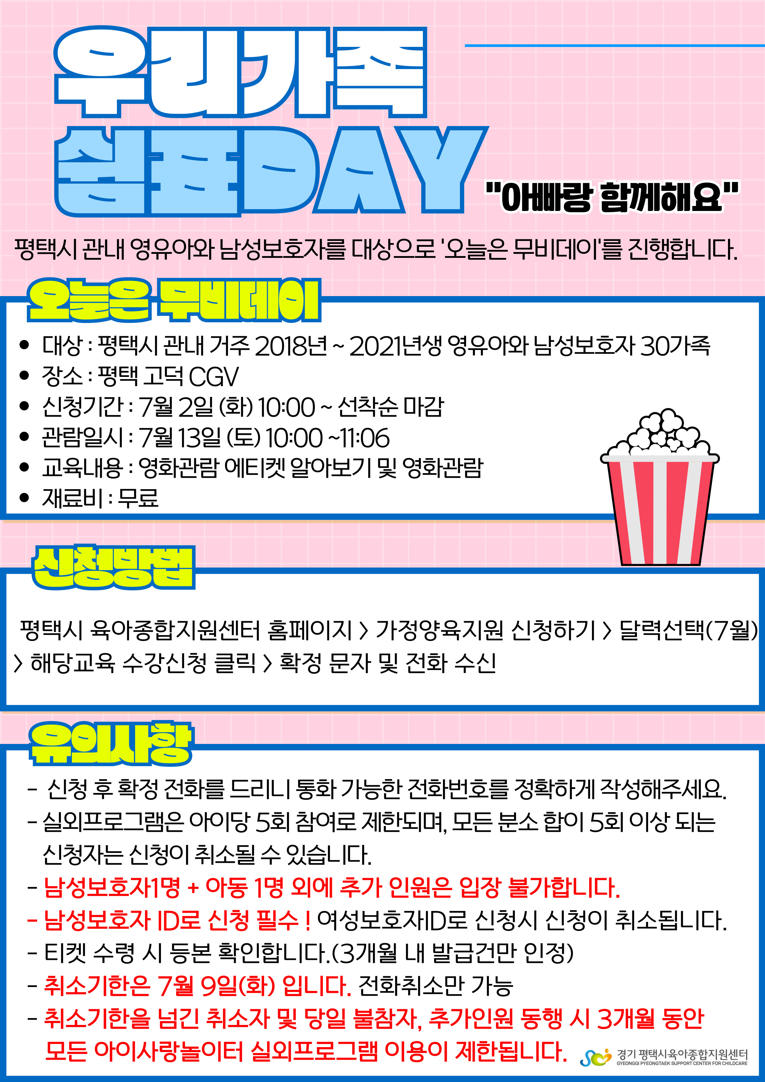 | 교육명 | *7.2.(화) 신청* [아빠-자녀] 우리가족 쉼표데이 '오늘은 무비데이' | 교육형태 | 오프라인 소규모 |
