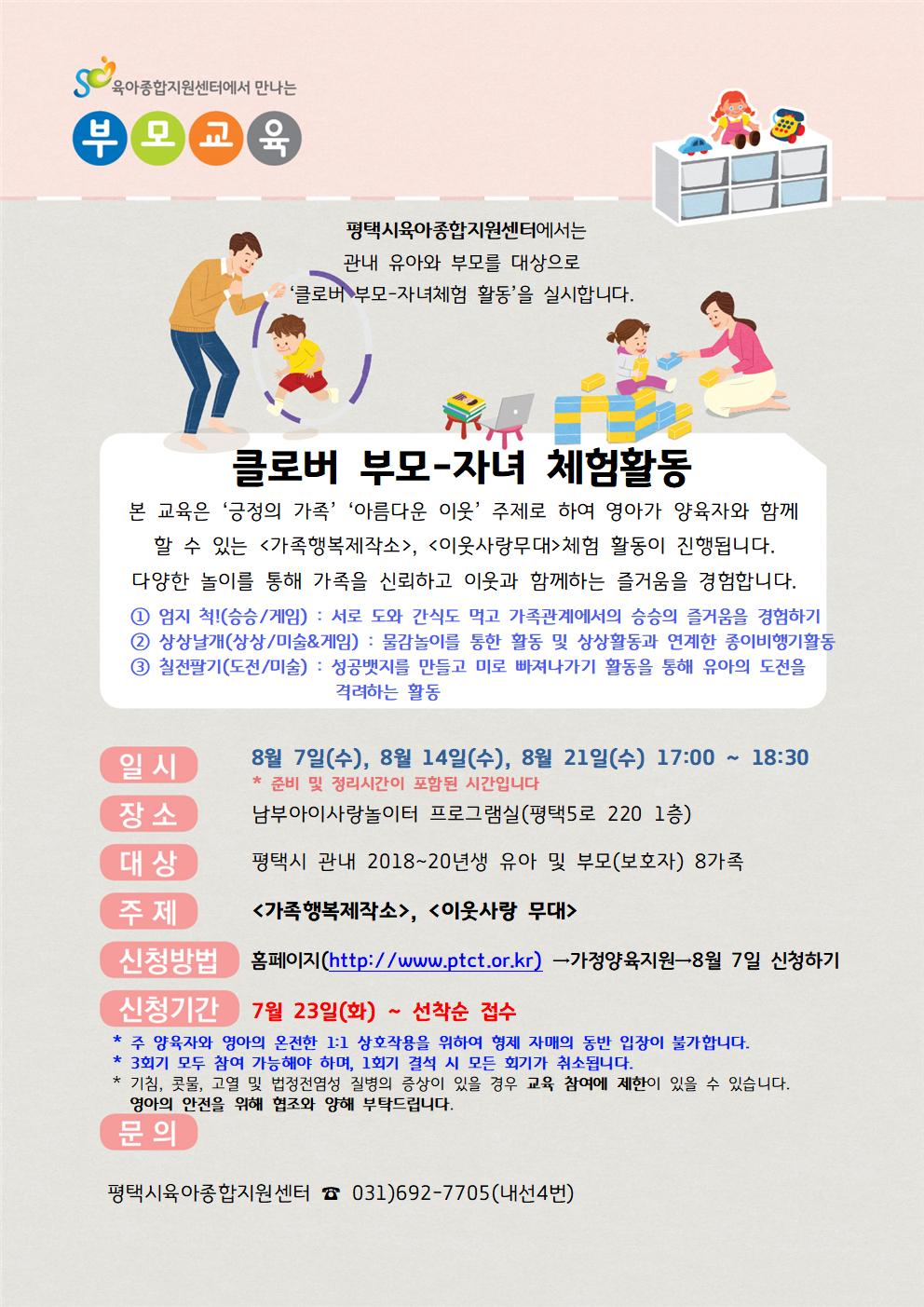 | 교육명 | 클로버 부모-자녀체험활동(18-20년생 유아) | 교육형태 | 오프라인 소규모 |