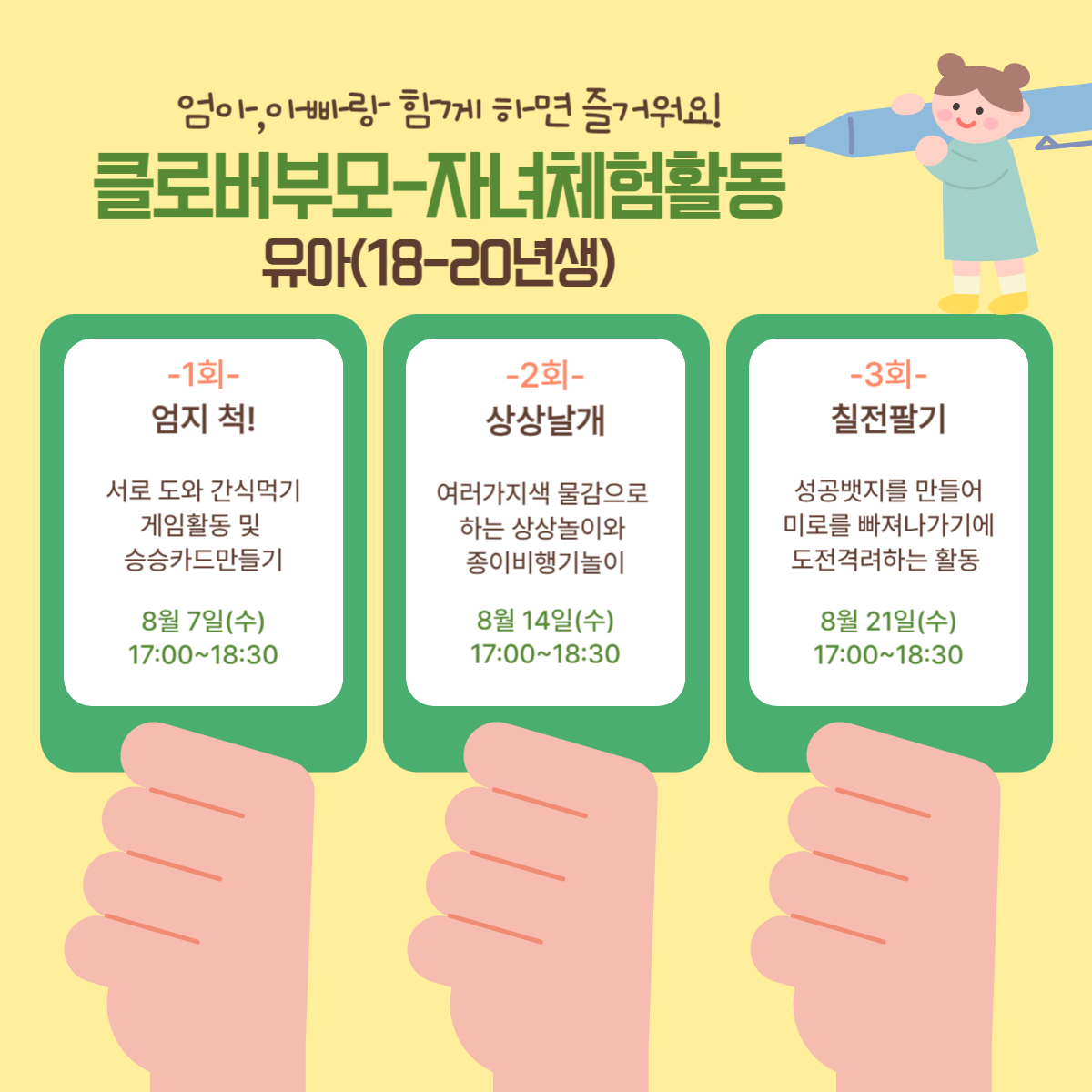 2024-08-07(수) 17시00분 ~ 18시30분 2024-08-14(수) 17시00분 ~ 18시30분 2024-08-21(수) 17시00분 ~ 18시30분 |