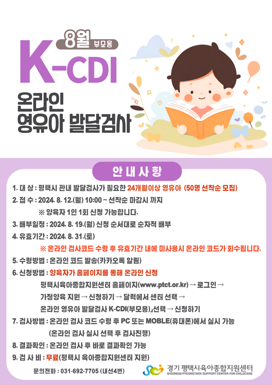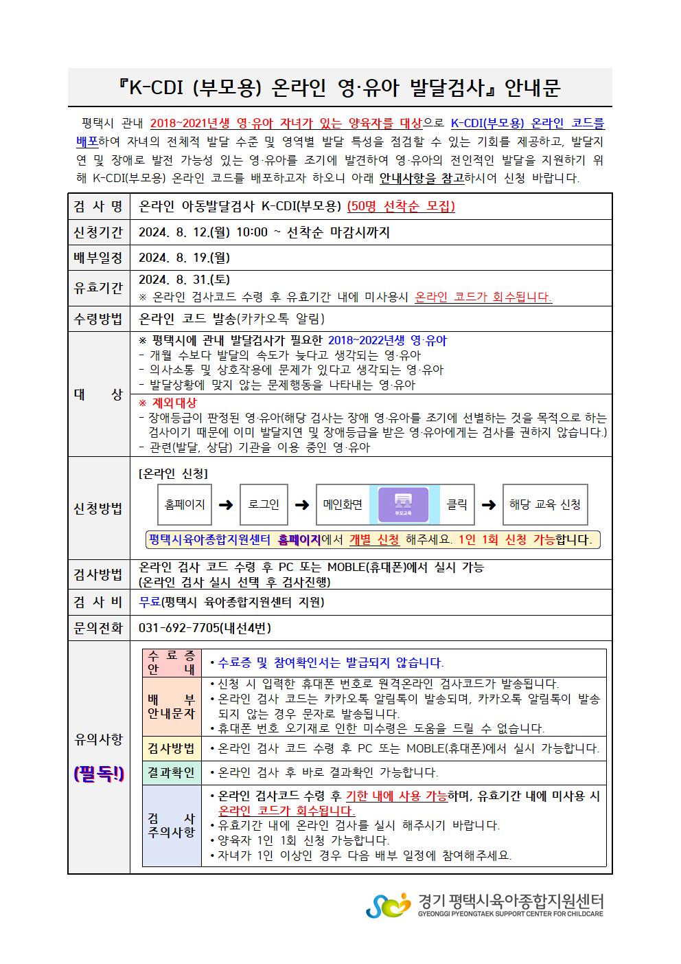 | 교육명 | [부모용] 온라인 영유아 발달검사K-CDI 검사 코드 발송[8. 19.(월) 순차적으로 배부] | 교육형태 | 온라인 검사 |