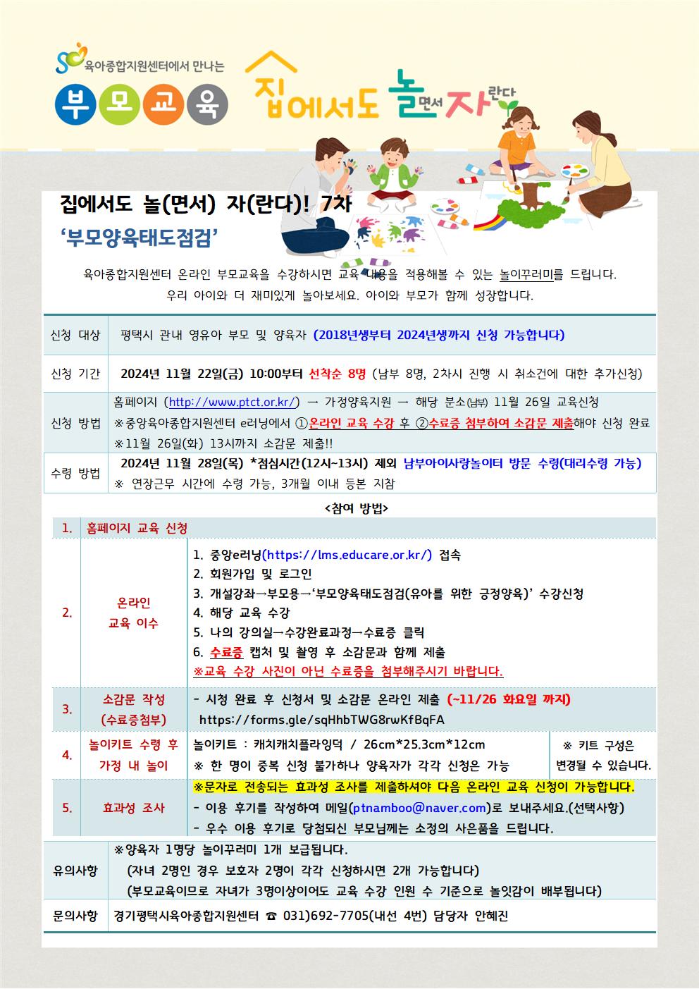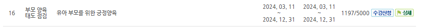 집에서도 놀(면서) 자(란다)!7차 주제 : 부모양육태도점검 (유아부모를 위한 긍정양육) ***반드시 수강 이후 소감문(수료증 첨부)을 작성해 주셔야 놀이꾸러미가 배부됩니다.*** 소감문 링크 : https://forms.gle/sqHhbTWG8rwKfBqFA ***반드시 읽어주세요**** * 신청완료 후 확정문자를 보내드리지 않습니다. ① 센터 홈페이지 신청 - 11/26 신청날짜는 온라인 교육을 이수 후 소감문을 제출해야하는 기한일 이므로 신청완료 확인 후 아래글을 참고하여 온라인 교육을 이수해 주시기 바랍니다. ② 온라인 교육 이수 - 중앙 e러닝 홈페이지(https://lms.educare.or.kr/) 회원가입 및 로그인 - 개설강좌 → 부모용 → 부모양육태도점검(유아부모를 위한 긍정양육)' 수강신청 <중앙육아종합지원센터 E-러닝 교육목록 예시>