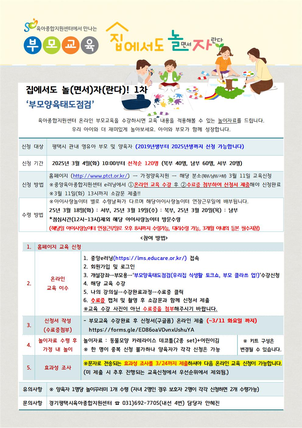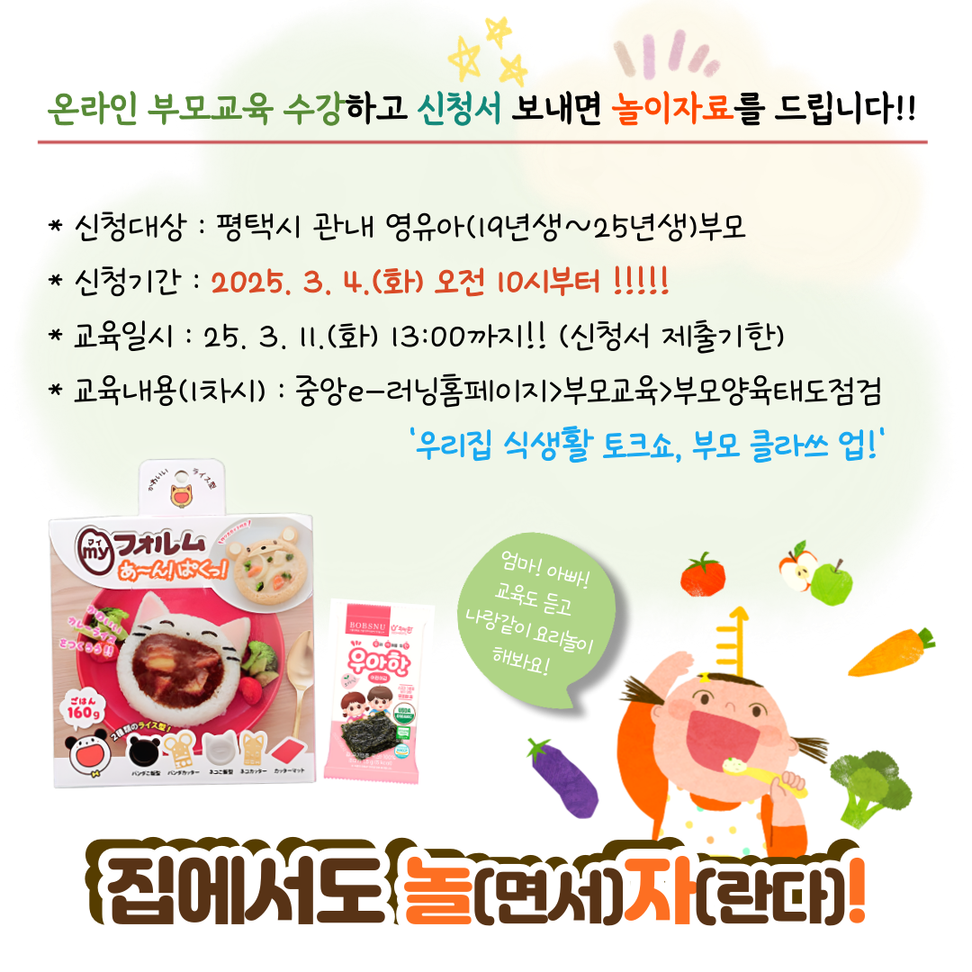 * 1차시 주제 : 부모양육태도점검( 우리집 식생활 토크쇼, 부모 클라쓰 업!) * 신청완료 후 확정문자를 보내드리지 않습니다. **신청서 링크 : https://forms.gle/Un3kFrpvJJtiE6kcA 교육 신청 후 반드시 중앙e-러닝 홈페이지에서 교육을 이수하신 후 위의 신청서 링크를 통해 제출해 주셔야 놀이자료를 배부 받으실 수 있습니다.