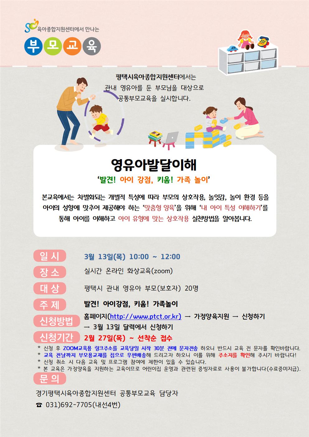 ※ 3/13(목) 전까지 신청자 명단을 확인 후 부모용 교재를 집으로 우편발송해 드립니다. 이에 따라 신청 시 반드시 회원정보의 주소지를 확인해 주시기 바랍니다. ☎ 문의 : 공통부모교육 담당자 (031-692-7705 내선 4번) |