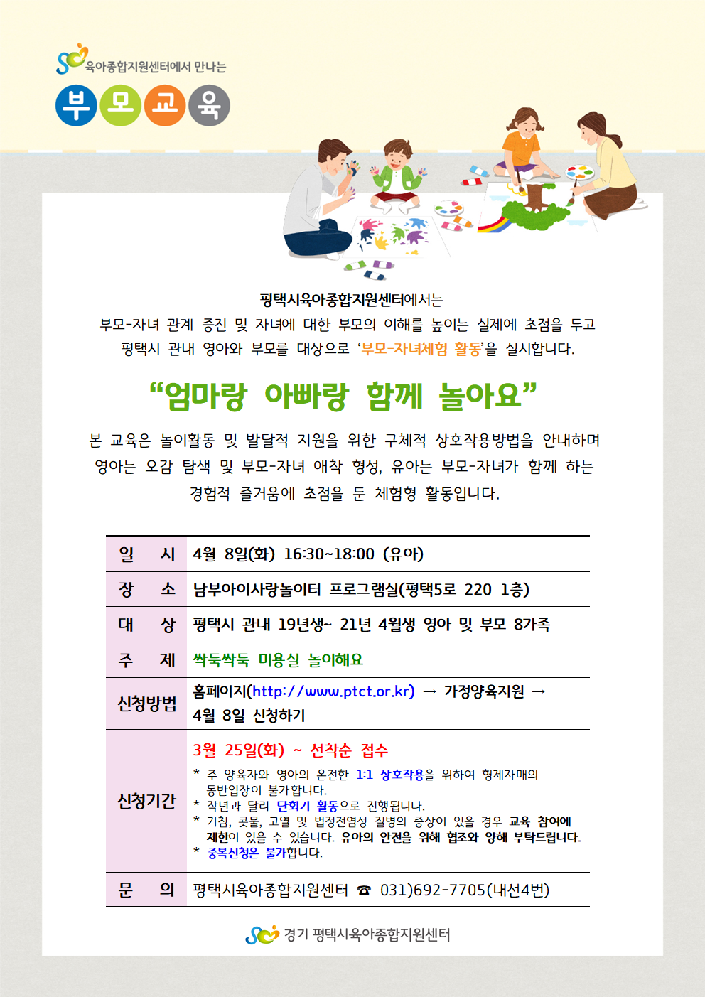 | 교육대상 | 부모 | 교육장소 | 남부아이사랑놀이터 프로그램실 |