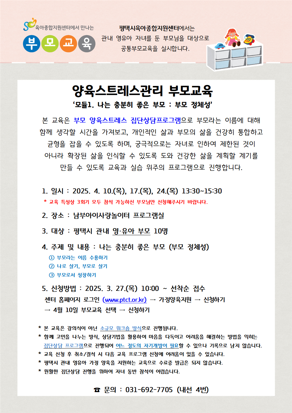 | 교육대상 | 부모 | 교육장소 | 남부아이사랑놀이터 프로그램실 |