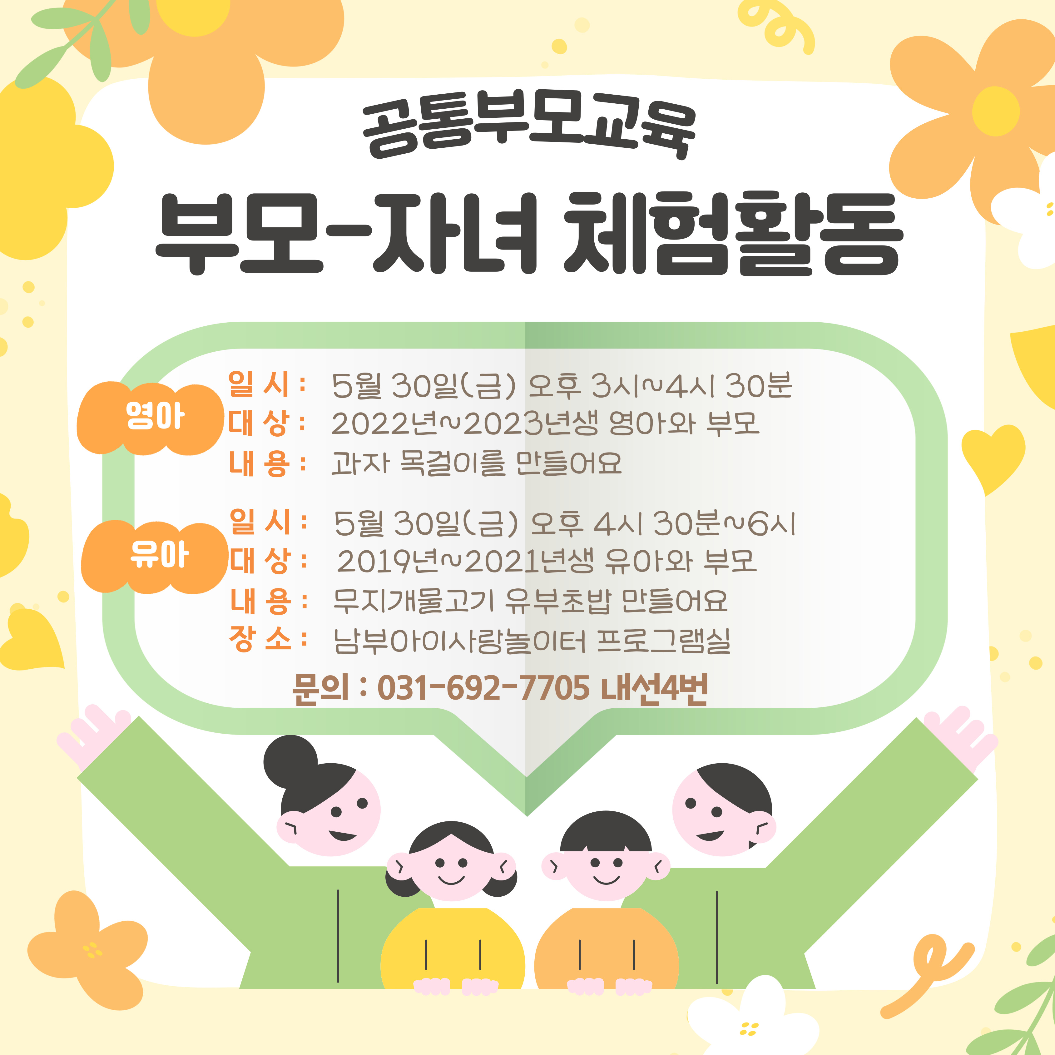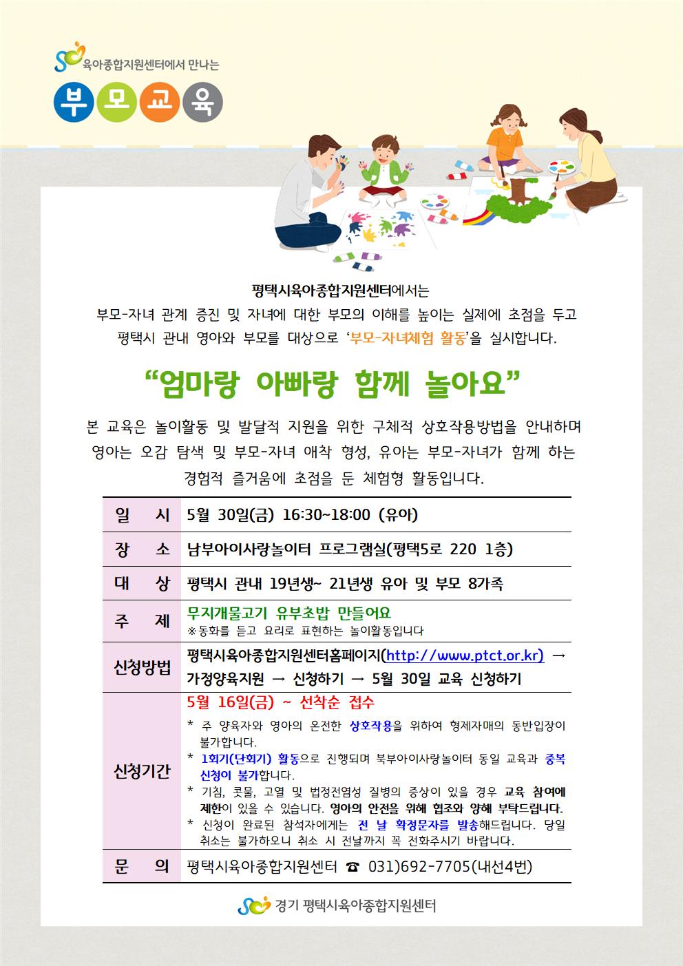 | 교육대상 | 부모 | 교육장소 | 남부아이사랑놀이터 프로그램실 |