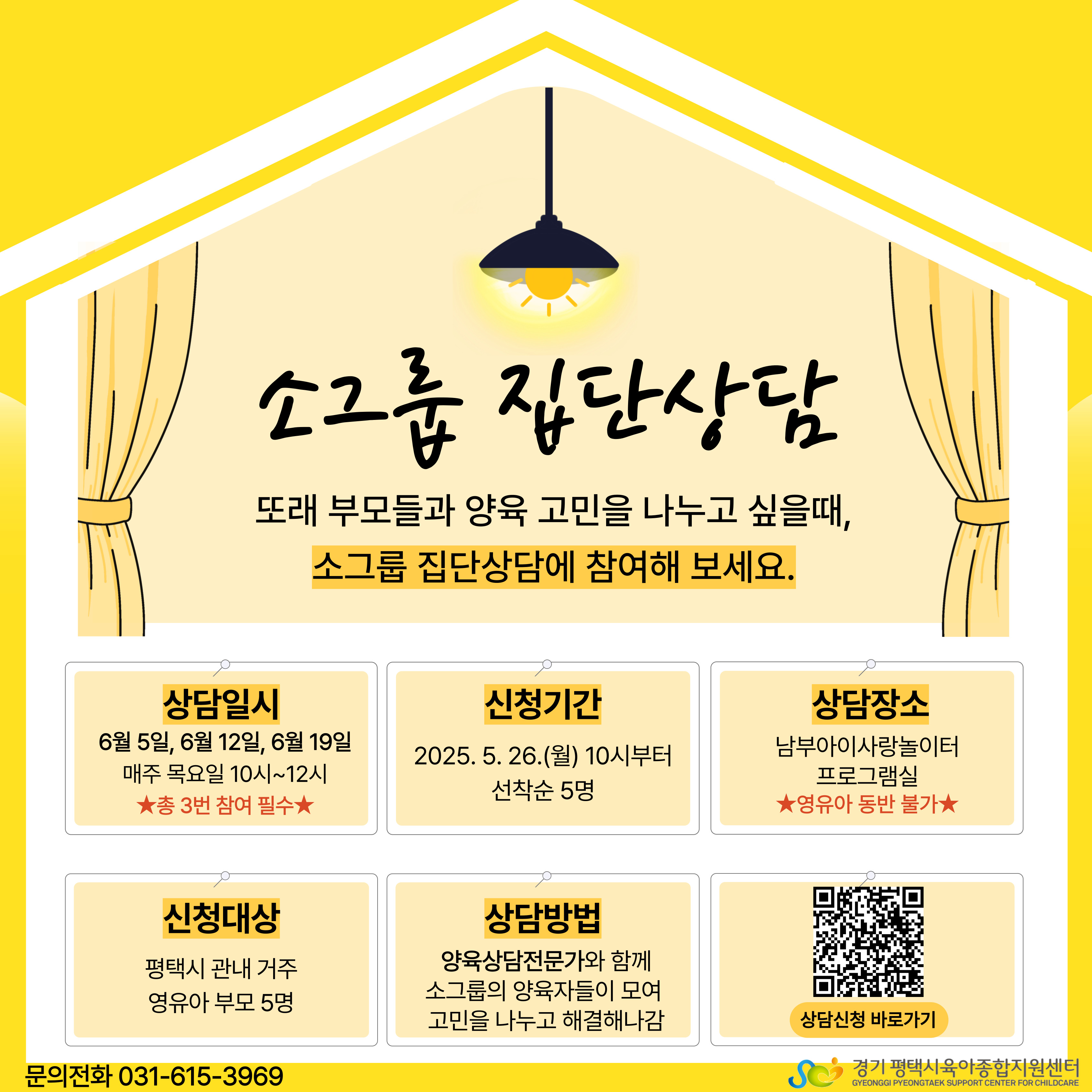 ▶ 상담진행장소 : 남부아이사랑놀이터 프로그램실 ▶ 신청 대상 : 평택시 관내 미취학 영유아 양육자 자녀를 둔 부모 및 양육자 5명 ▶ 진행 방법 : 부모집단상담(120분) ▶ 진행 절차 : 평택시육아종합지원센터 홈페이지 → 가정양육지원 → 신청하기 → 6월 5일 교육 신청하기 → 담당자의 안내 전화 → 부모집단상담 진행