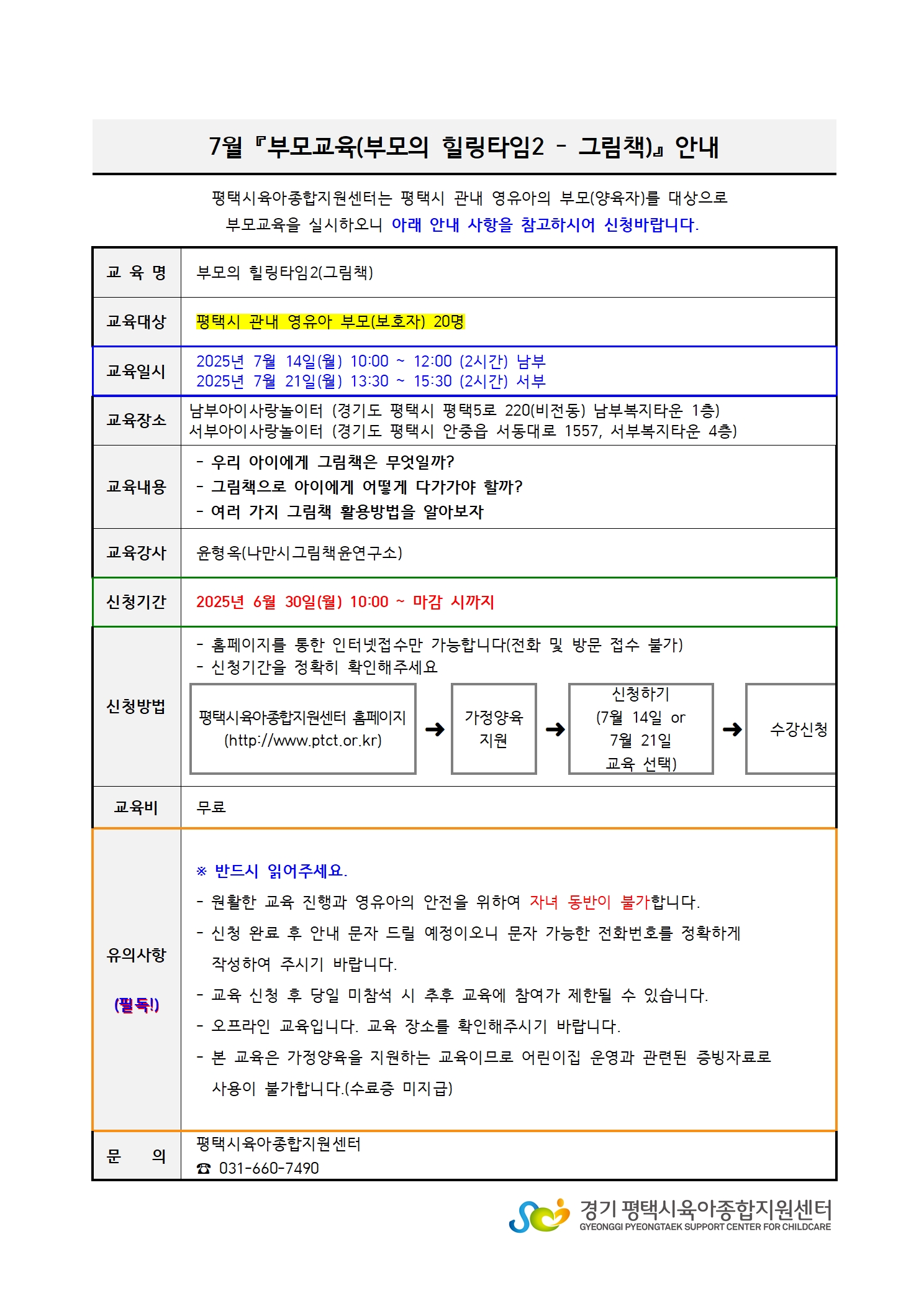 | 교육대상 | 부모 | 교육장소 | 남부아이사랑놀이터 프로그램실 |