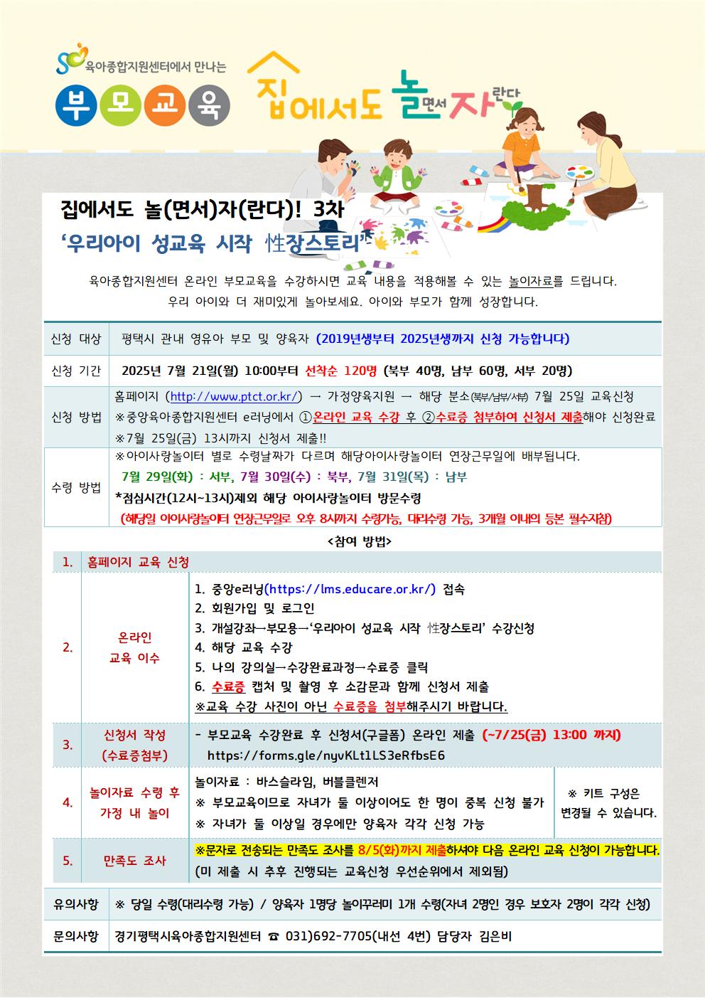 * 신청완료 후 확정문자를 보내드리지 않습니다. 접수가 완료되면 링크를 통해 신청서 보내주시면 됩니다. **신청서 링크 : https://forms.gle/nyvKLt1LS3eRfbsE6 ***7/25(금)까지 신청서 접수!! / 7/31(목) 놀이꾸러미 배부!! 교육 신청 후 반드시 중앙e-러닝 홈페이지에서 교육을 이수하신 후 위의 신청서 링크를 통해 제출해 주셔야 놀이자료를 배부 받으실 수 있습니다.