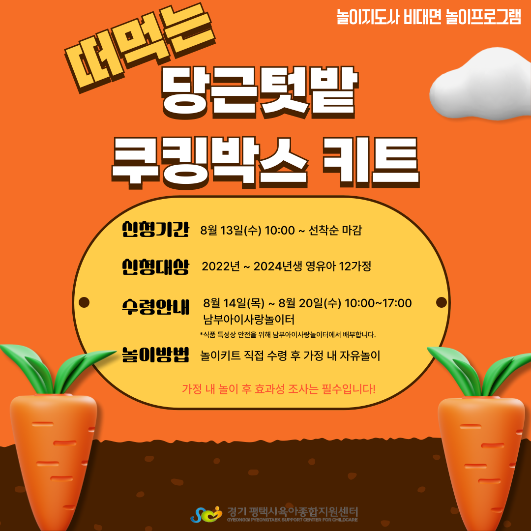 | [놀이지도사 비대면 놀이프로그램] 놀이랜드:집에서 놀아요! -8월- 떠먹는 당근텃밭 쿠킹박스 ※안내문 미숙지로 인한 불이익은 신청자에게 있으니 꼭 읽어주시기 바랍니다.※
