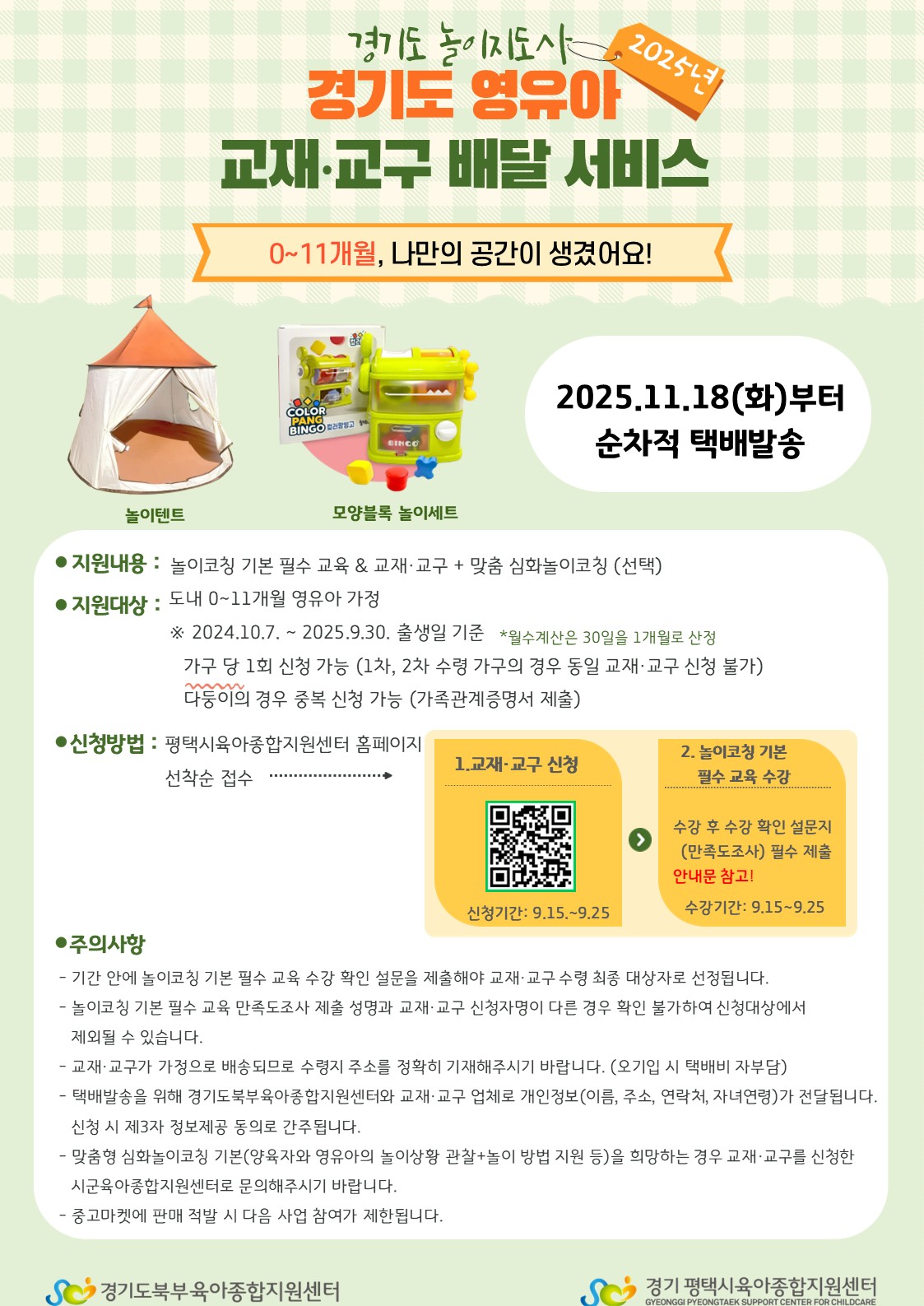 ▶ 신청 대상 : 평택시 관내 거주 0~11개월 (2024. 10. 7. ~ 2025. 9. 30) 영유아 가정