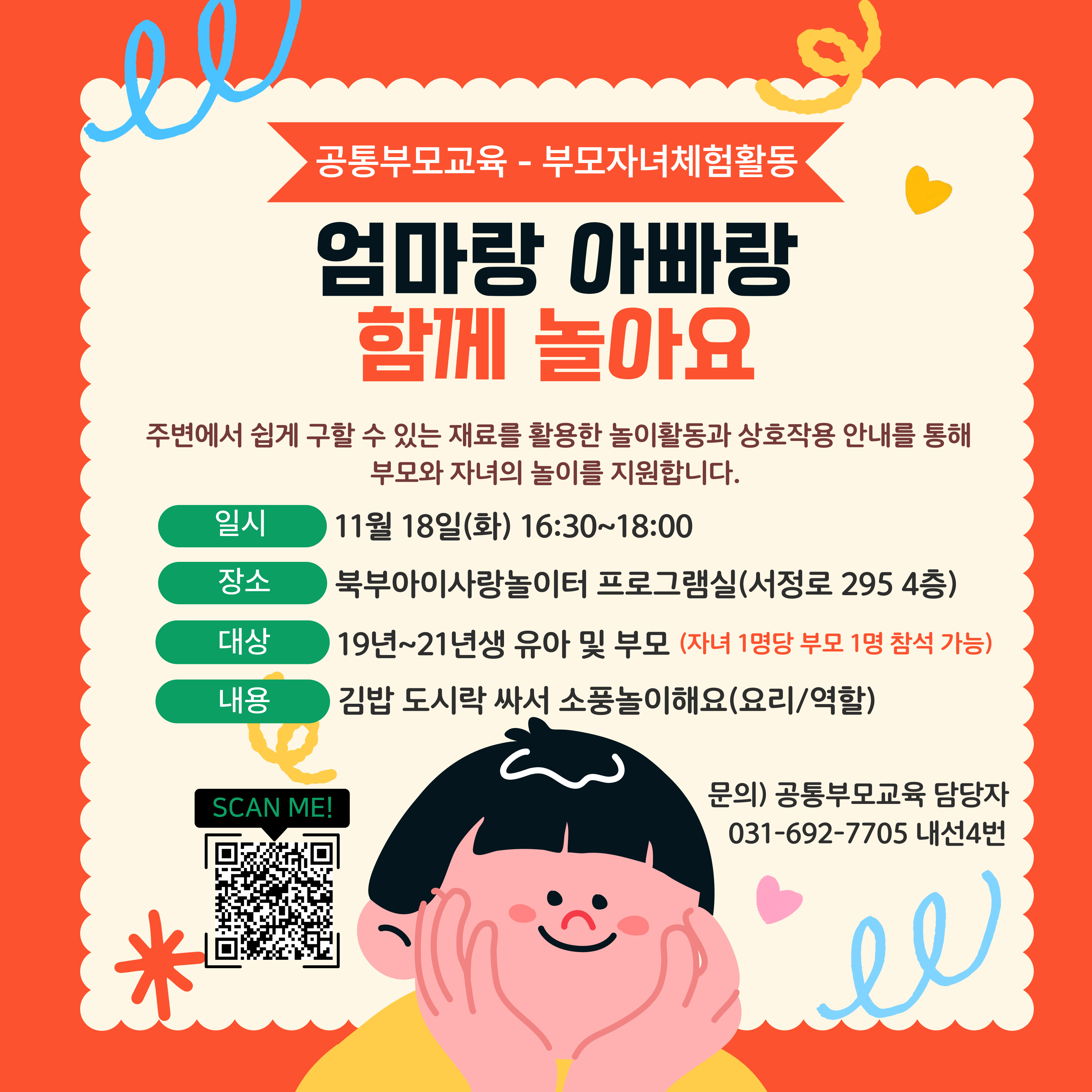 | 교육대상 | 부모 | 교육장소 | 북부아이사랑놀이터 프로그램실 |