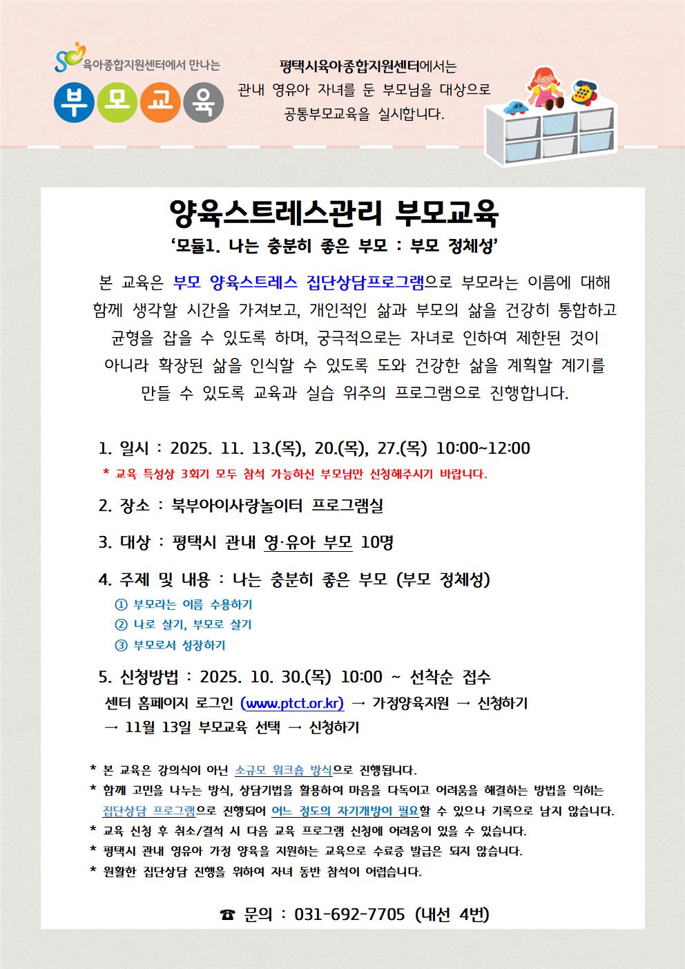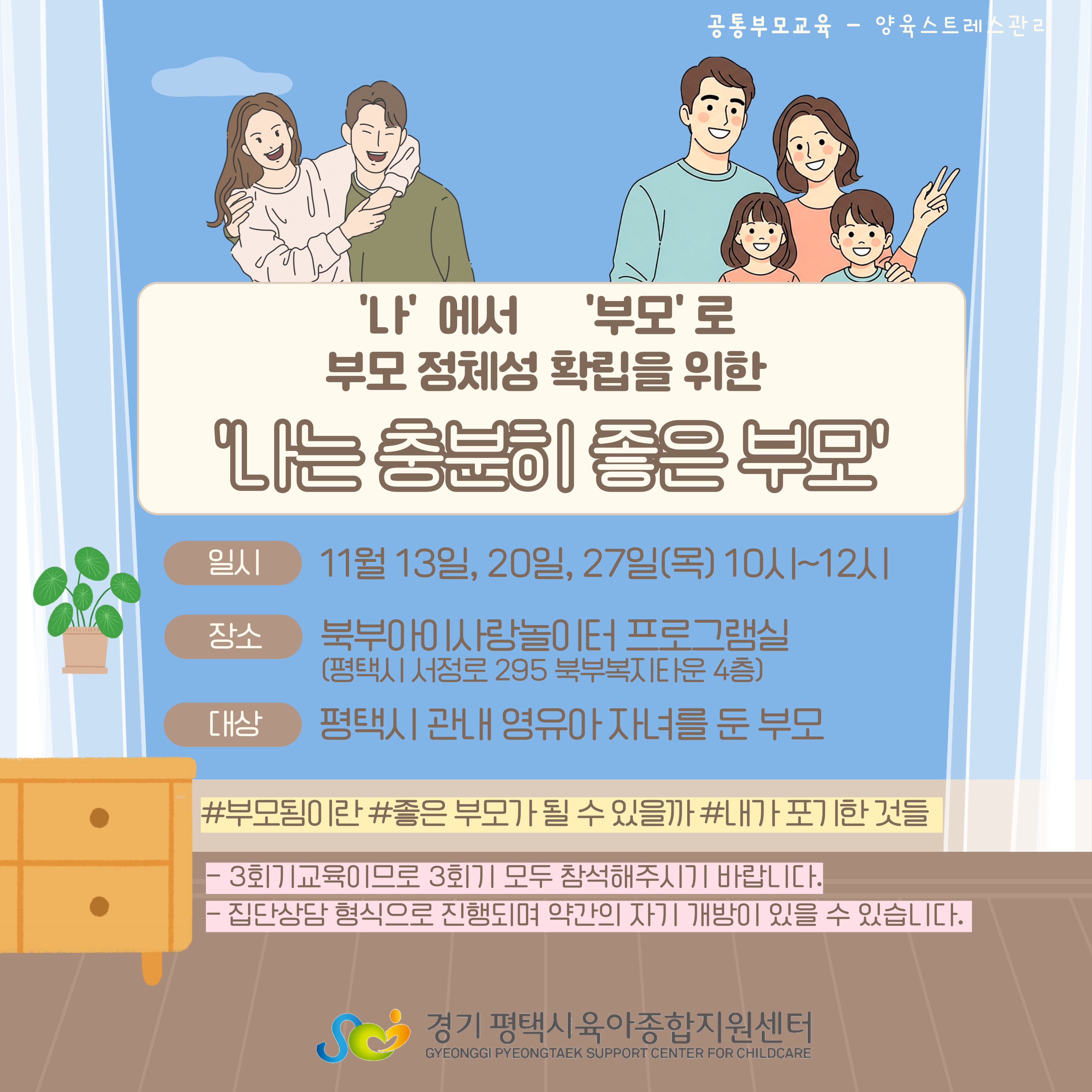 | 교육명 | 양육스트레스관리 : 나는 충분히 좋은 부모(부모정체성) | 교육형태 | 오프라인 소규모 |