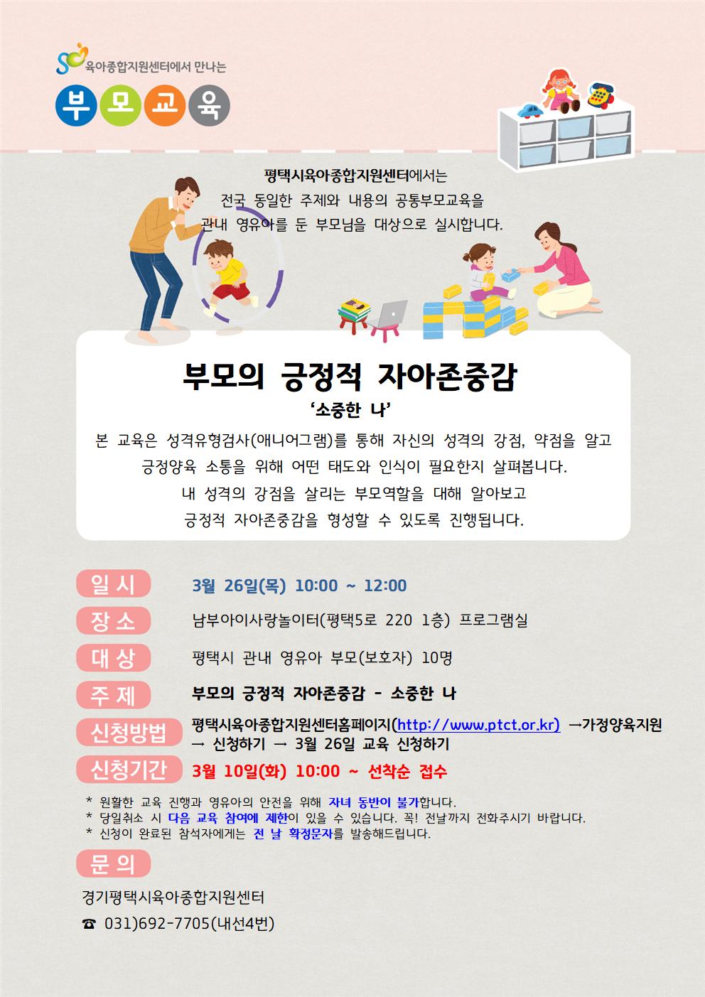 | 교육대상 | 부모 | 교육장소 | 남부아이사랑놀이터 프로그램실 |