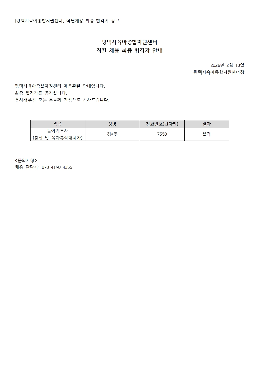 [평택시육아종합지원센터] 직원채용 최종 합격자 공고