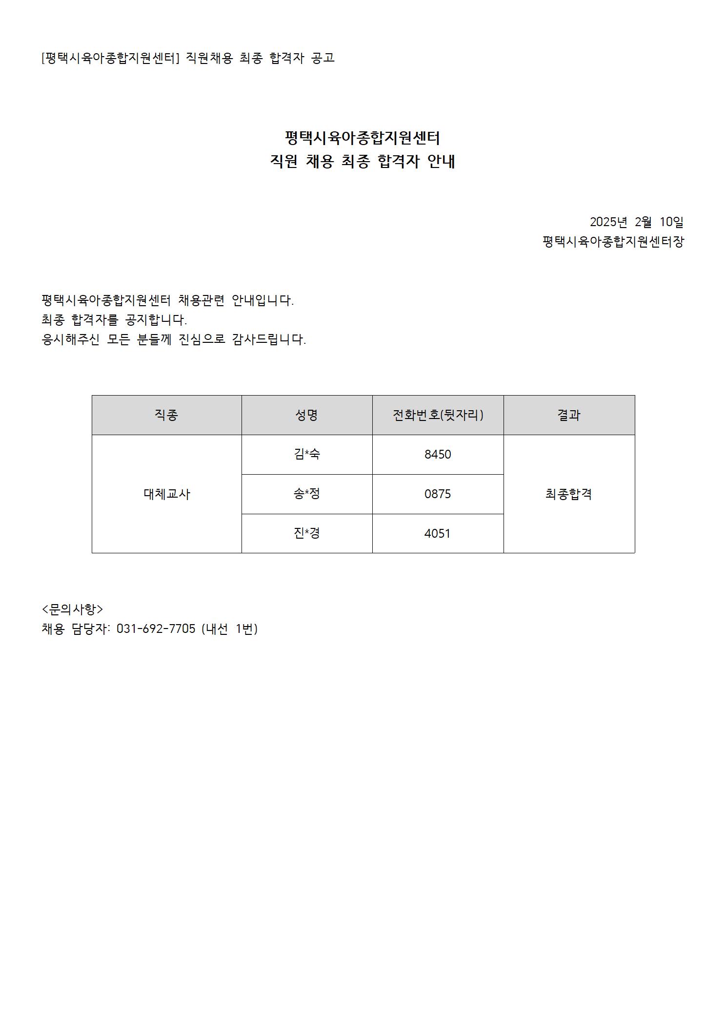 [평택시육아종합지원센터] 직원채용 최종 합격자 안내(대체교사)