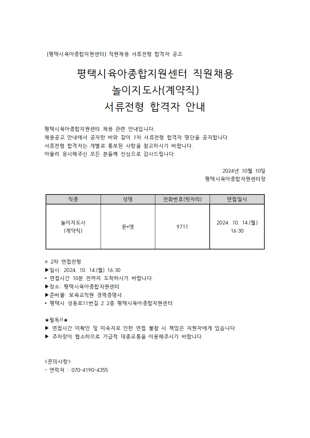 [평택시육아종합지원센터] 직원채용 1차 서류전형 합격자 안내(놀이지도사-계약직)