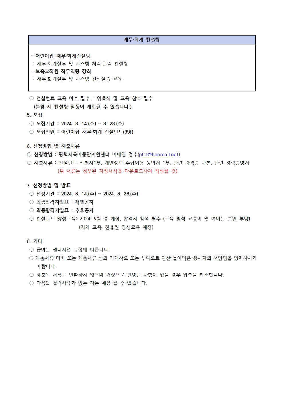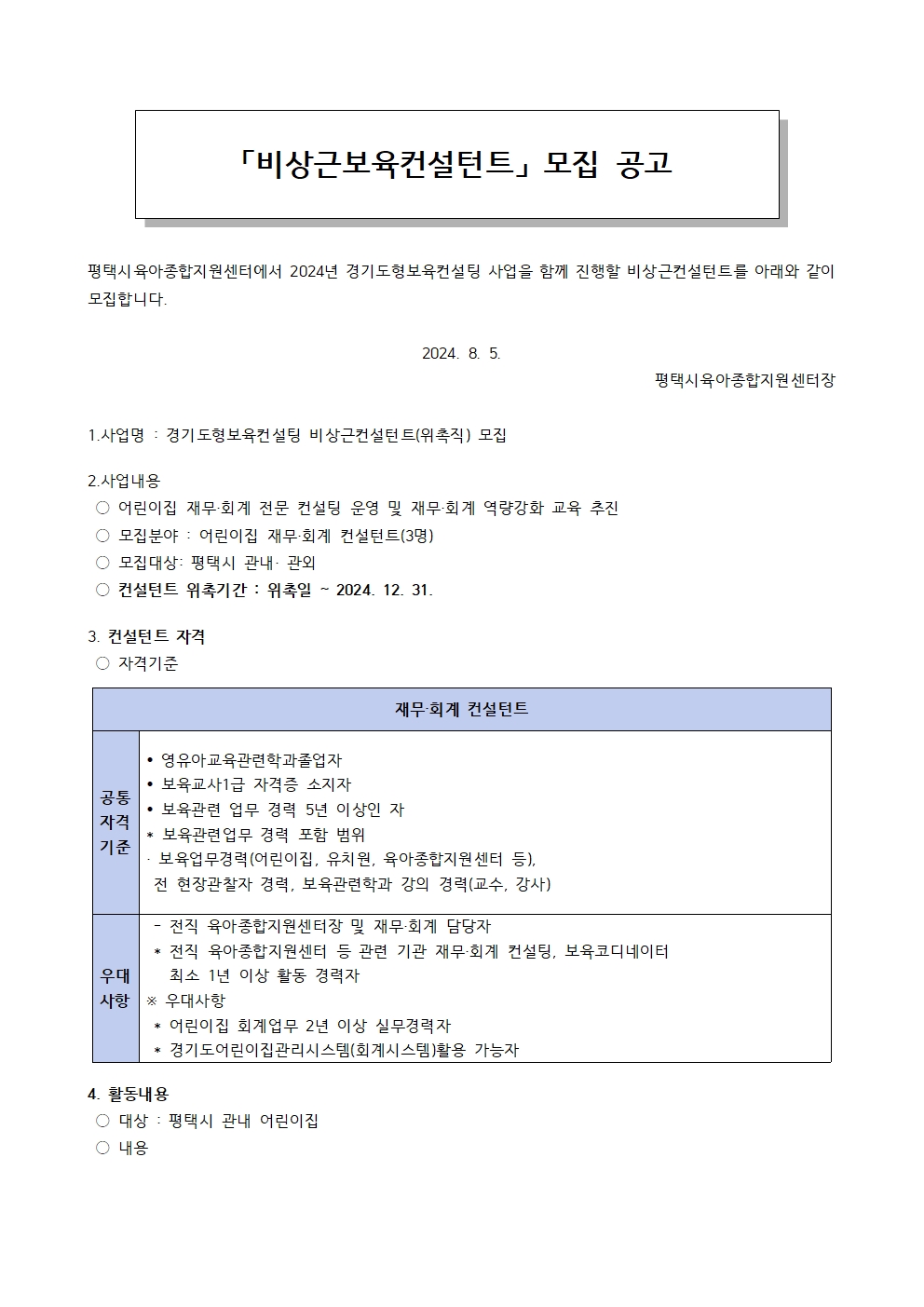 [평택시육아종합지원센터] 비상근 컨설턴트 (재무회계) 위촉 예정 공고