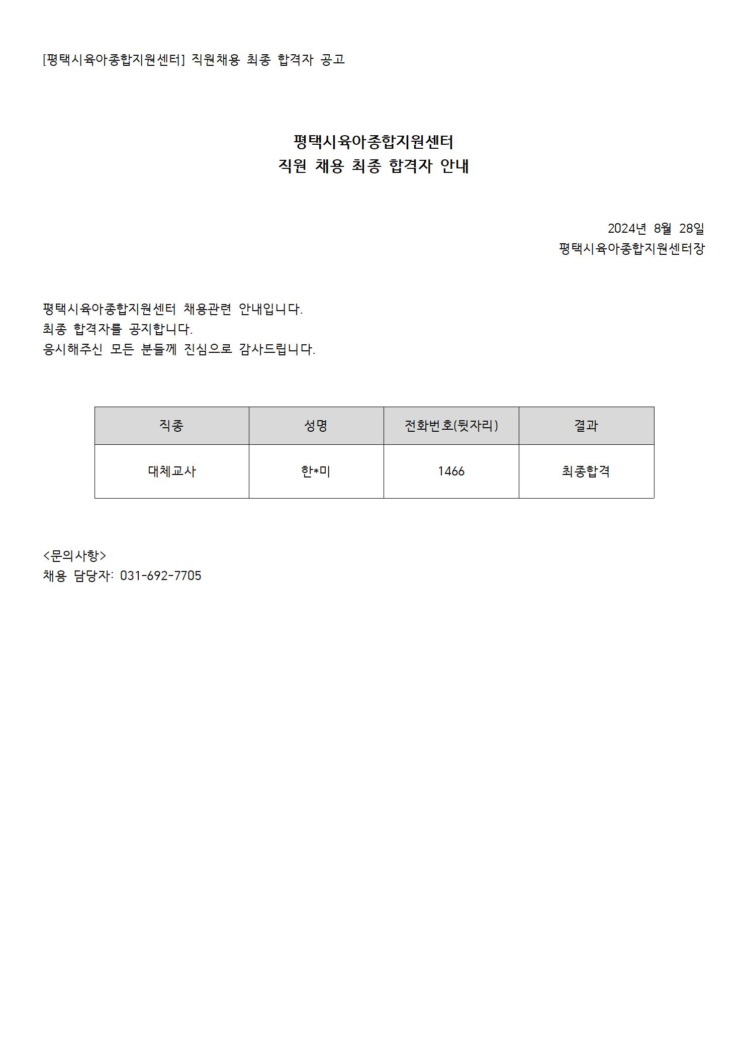[평택시육아종합지원센터] 직원 채용 최종 합격자 공고(대체교사)