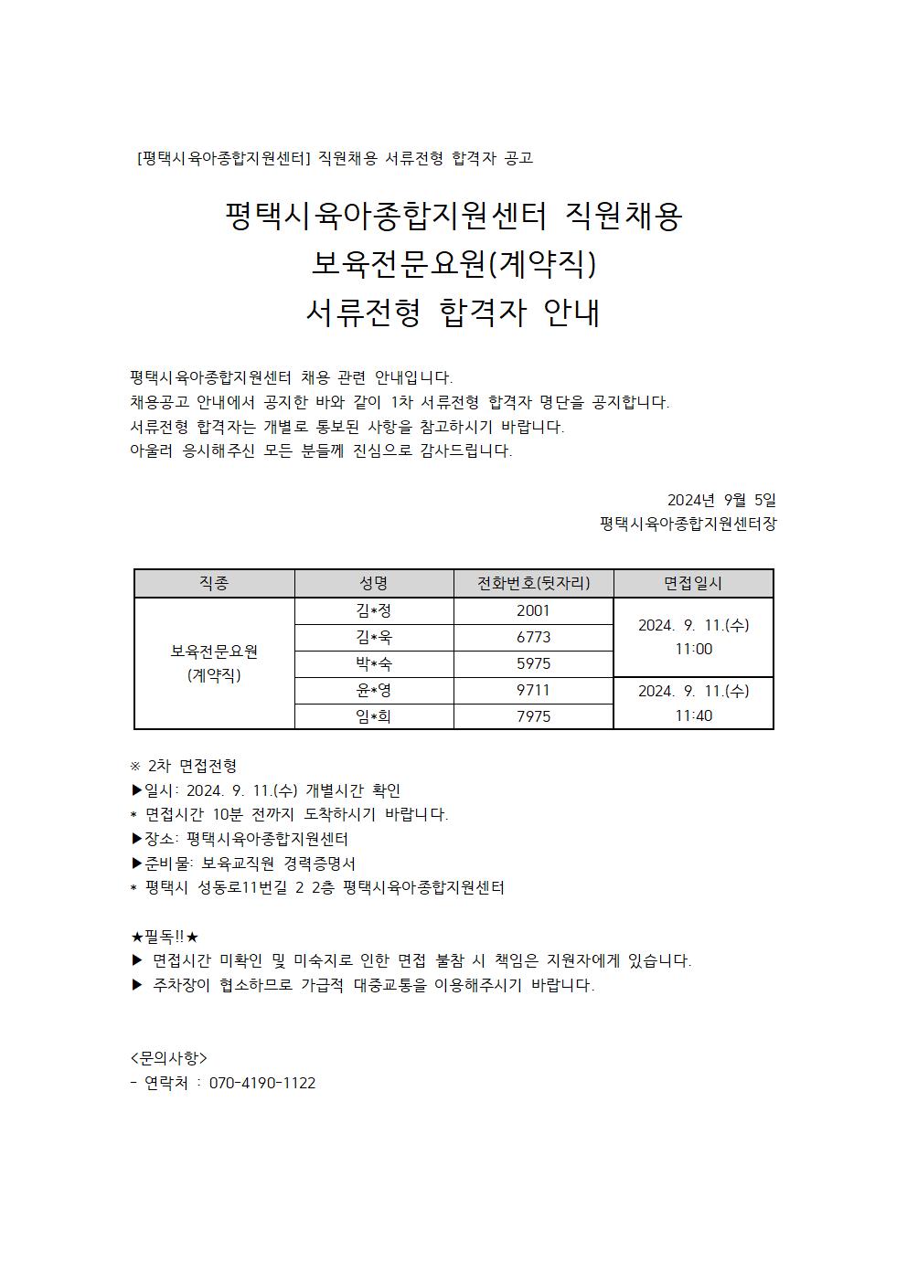 [평택시육아종합지원센터] 직원채용 1차 서류전형 합격자 안내(보육전문요원-계약직)