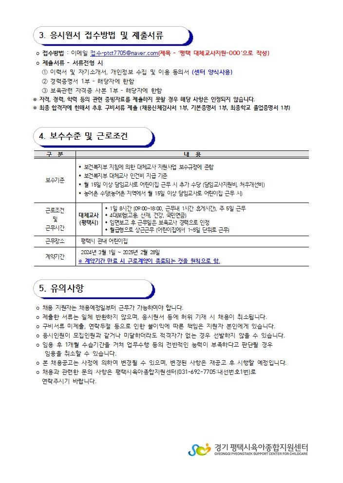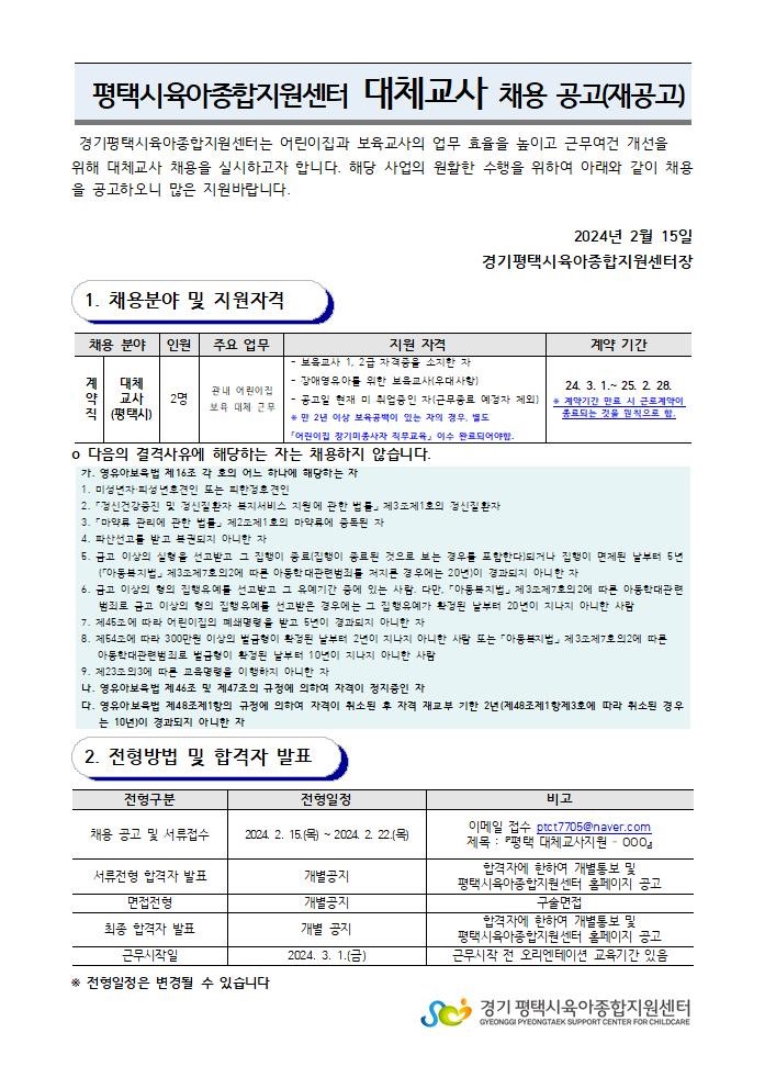 [평택시육아종합지원센터] 직원 채용 재공고(대체교사)